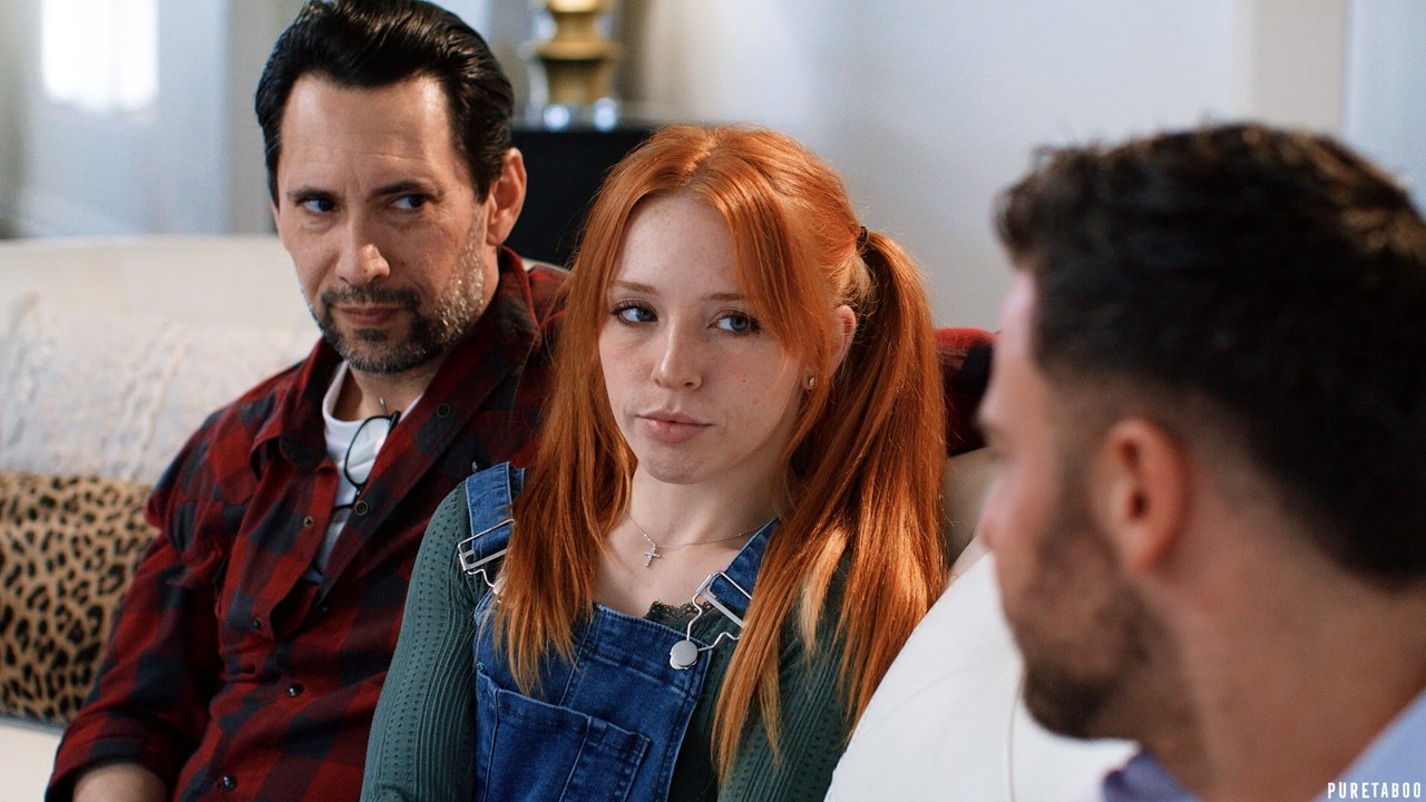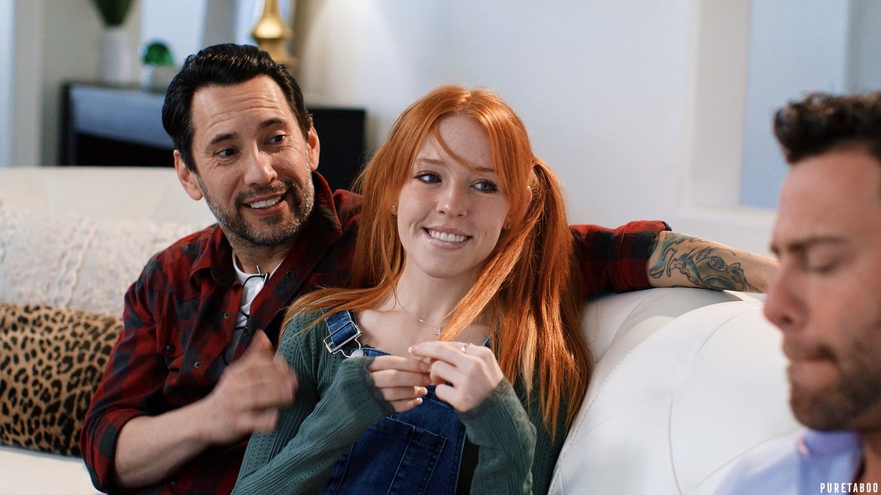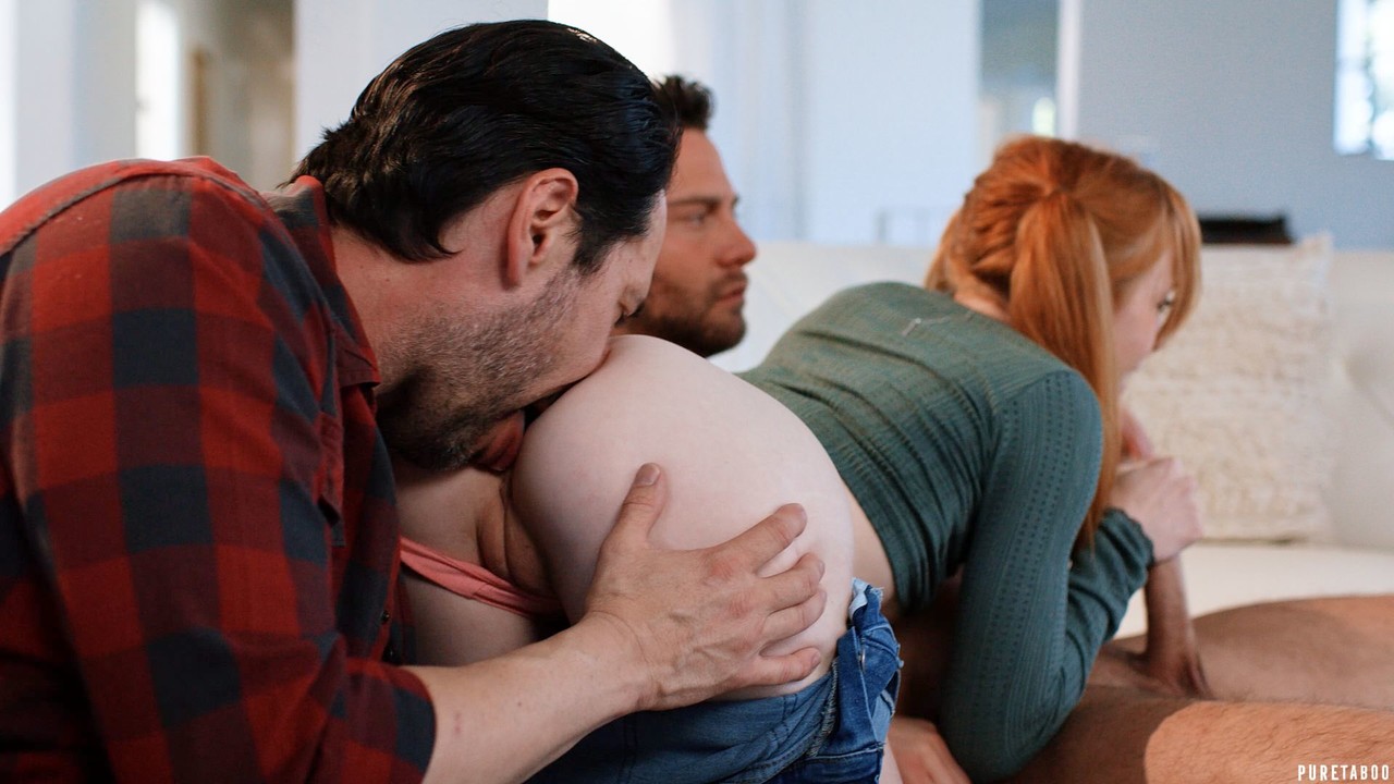 Petite redhead teen Madi Collins takes hard DP from stepdad and pal in raw family 3some, cowgirl anal, messy cumshot.