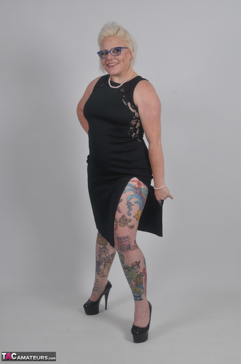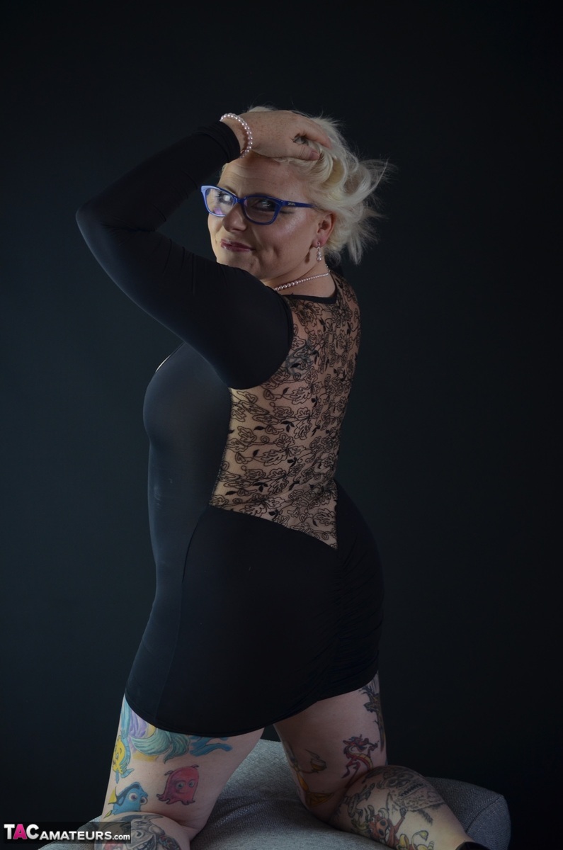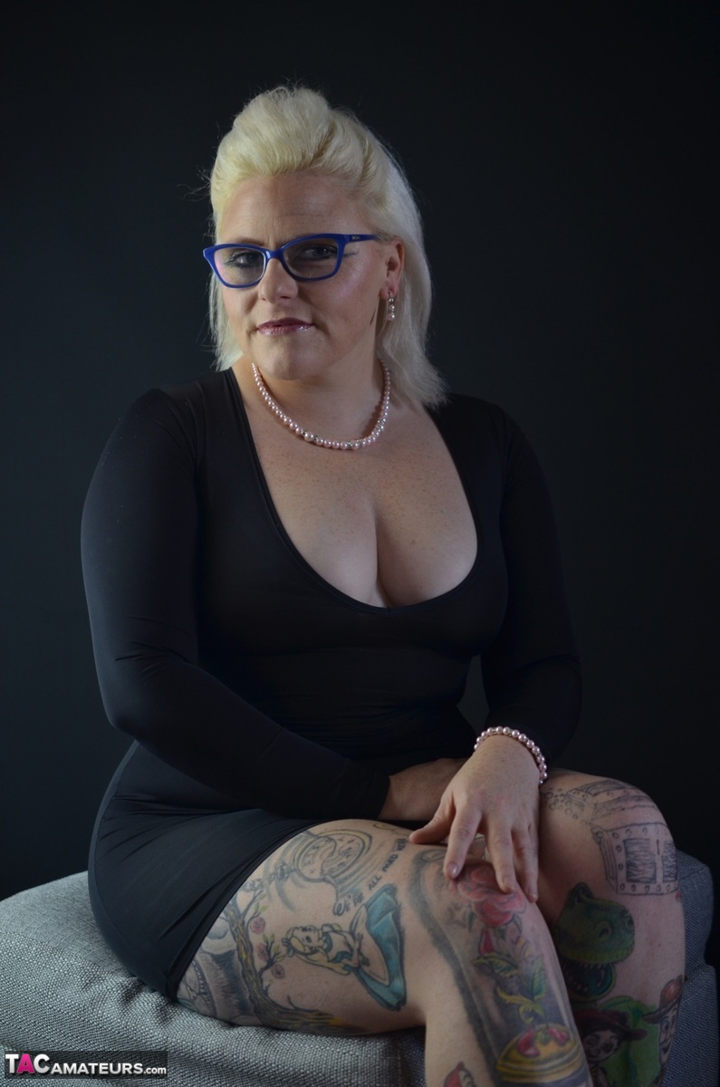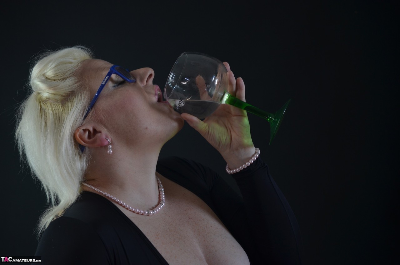 Tattooed blonde Mollie Foxxx, a curvy British BBW mature in glasses, teases before sipping from goblet. Chubby redhead over 60, amateur clothed.