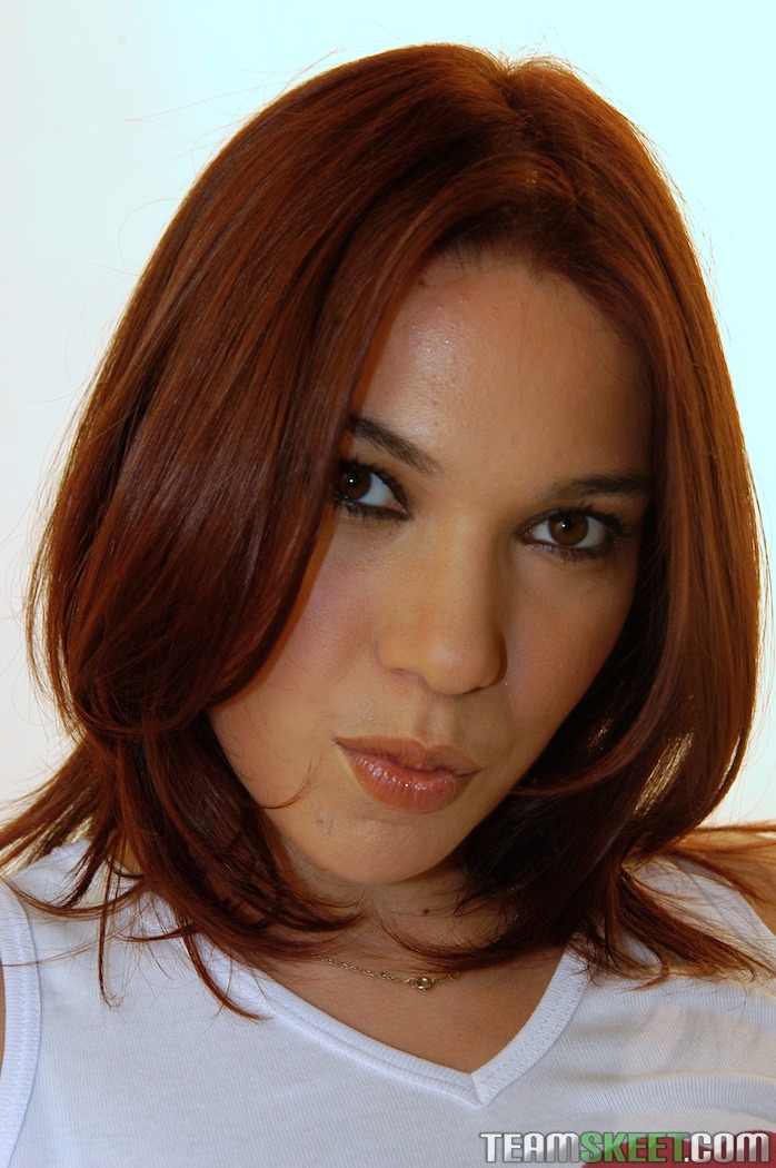Argentinian redhead teen Claudia Garcia slips off white outfit, spreads smooth Latina pussy and poses in heels for cute nude gallery.