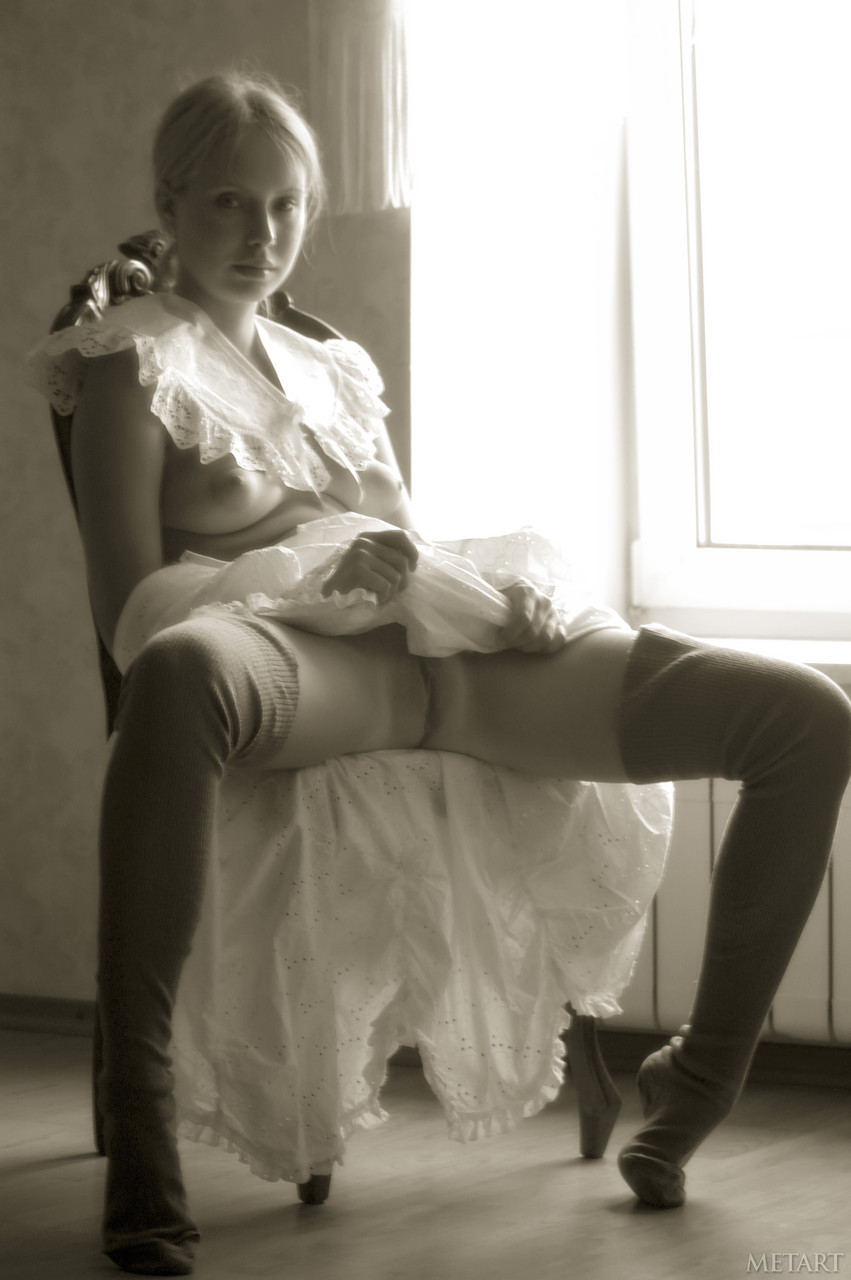 Window babe in summer dress and stockings flashes puffy teen nipples and pantyless pussy, spreading cute retro ass for vintage classic lovers.