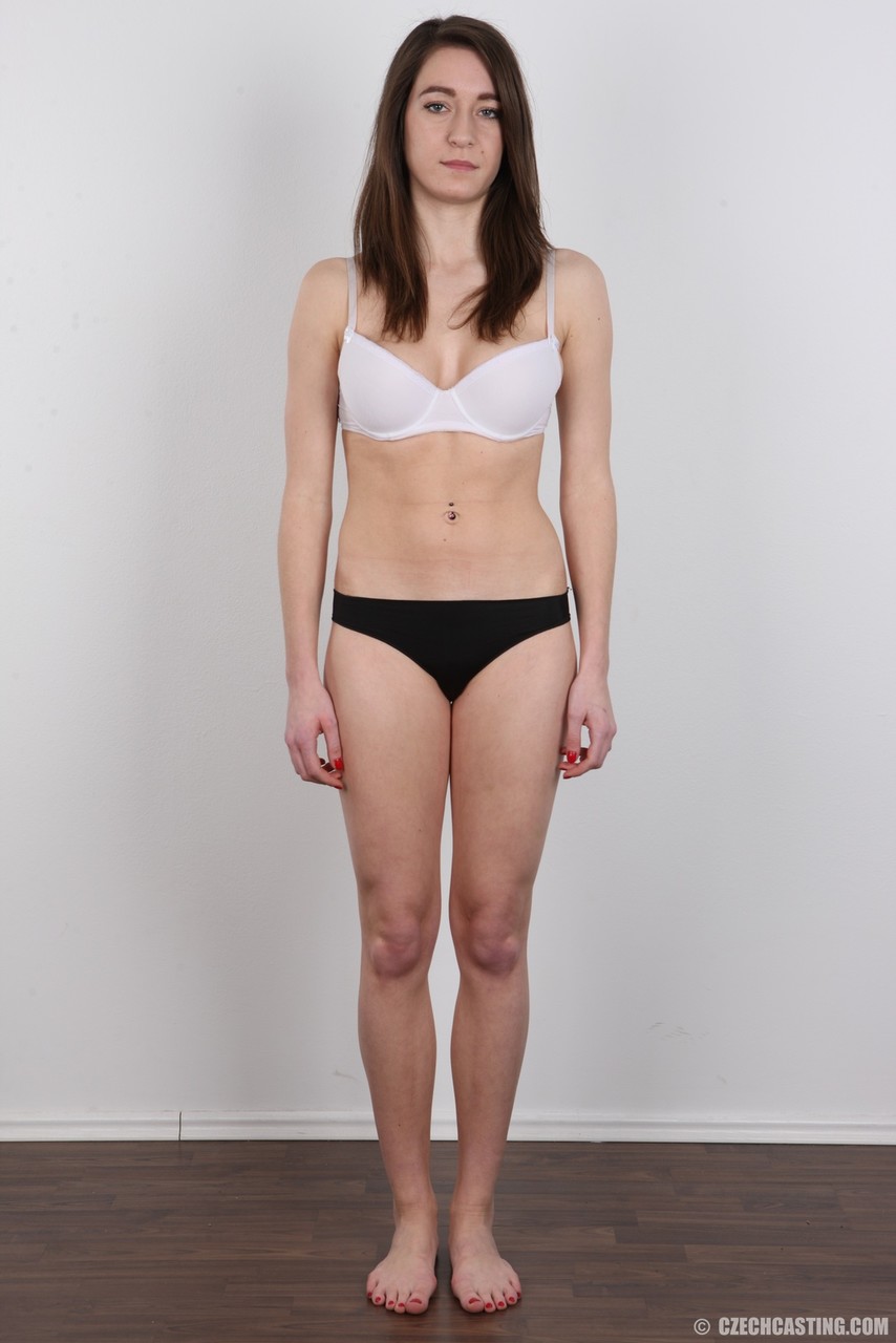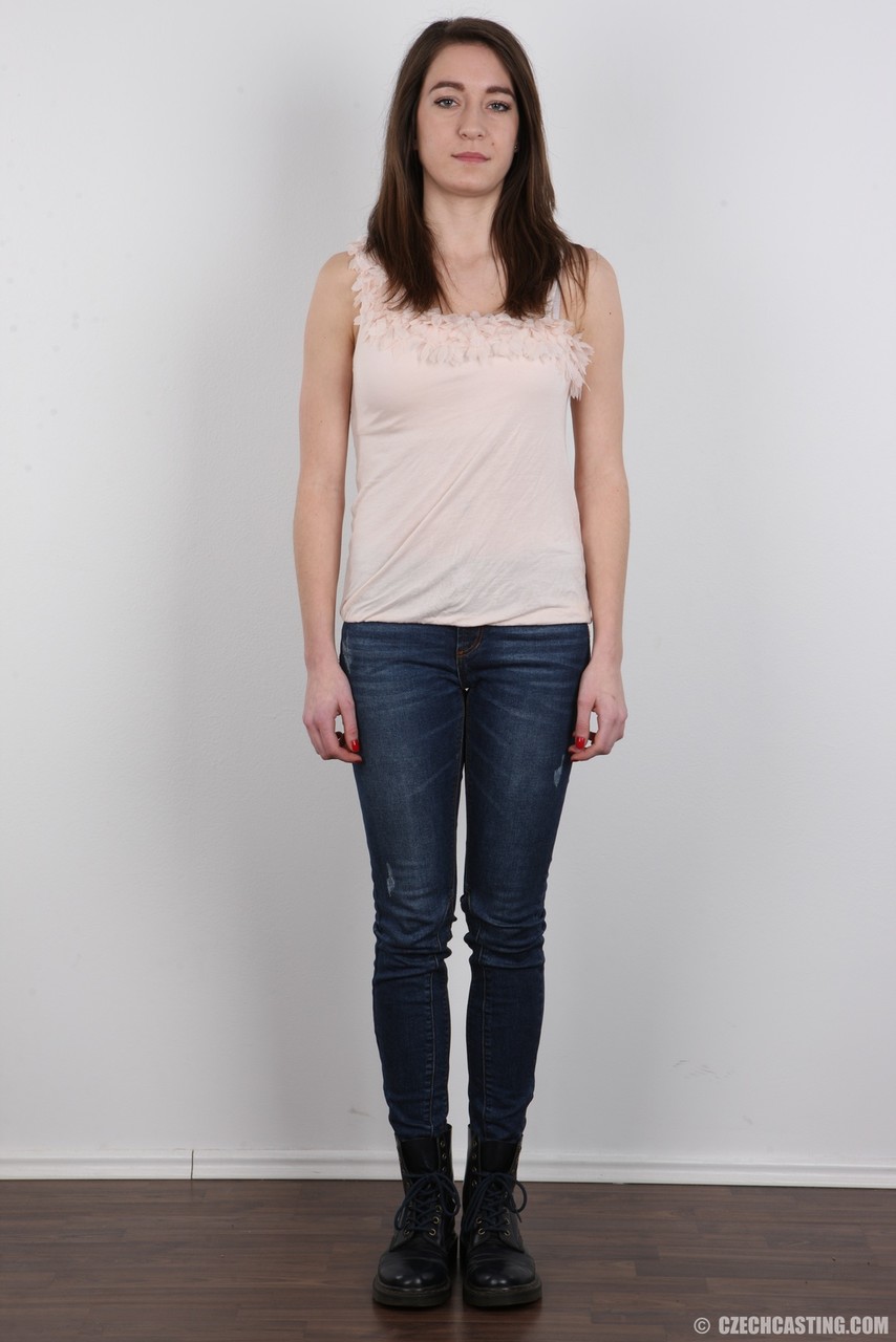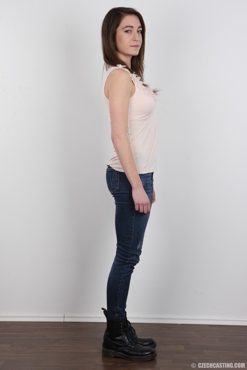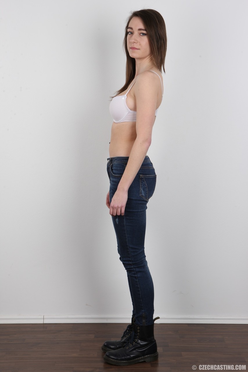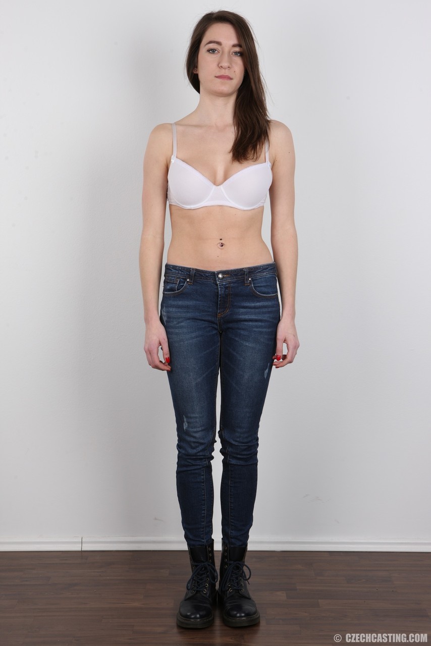 First-timer Nikol uncups her big natural saggy tits, posing topless in black panties and tight jeans, erect nipples on full display for this steamy Czech casting shoot.