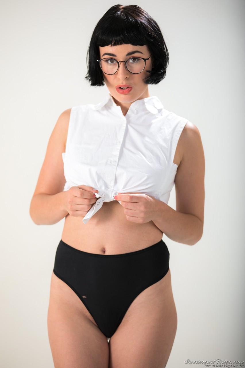 Die vollbusige Lehrerin mit braunen Haaren Olive Glass zieht sich völlig aus, zeigt ihre behaarte Muschi und ihre großen natürlichen Titten. Diese Kurzhaarschönheit mit Brille erregt in einem heißen Striptease.