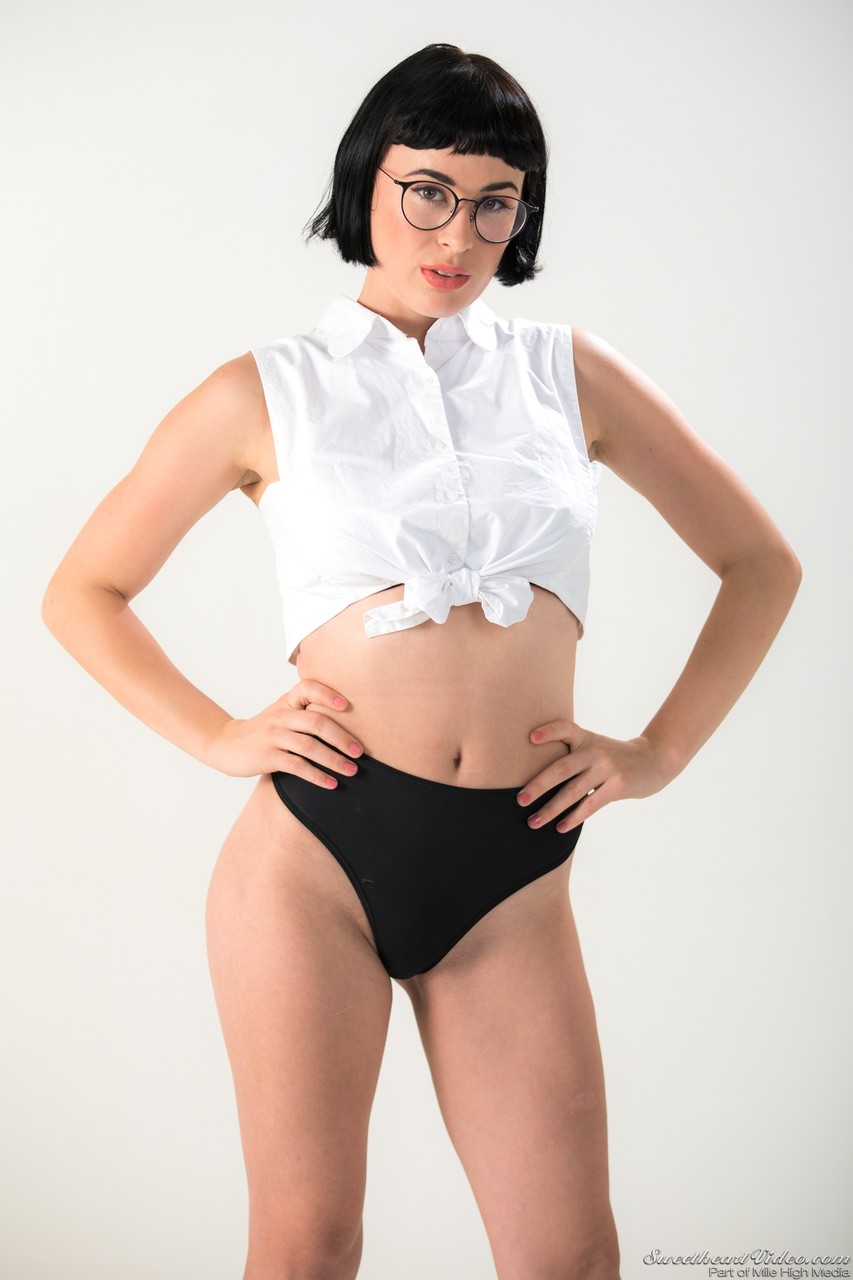 Schwarzhaariges Mädchen Olive Glass Zieht Brille Aus Bevor Sie Nackt Steht - Galerie-Informationen