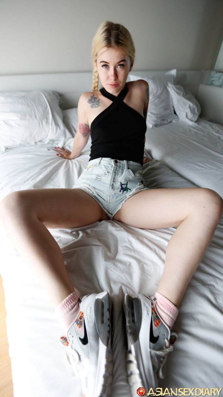 Ein asiatisches Mädchen mit Pferdeschwanz, Shelley, zeigt sich in Turnschuhen, ihre geschwollenen Schamlippen in einem Hotelzimmer spreizend, bevor sie rohen POV-Sex hat.
