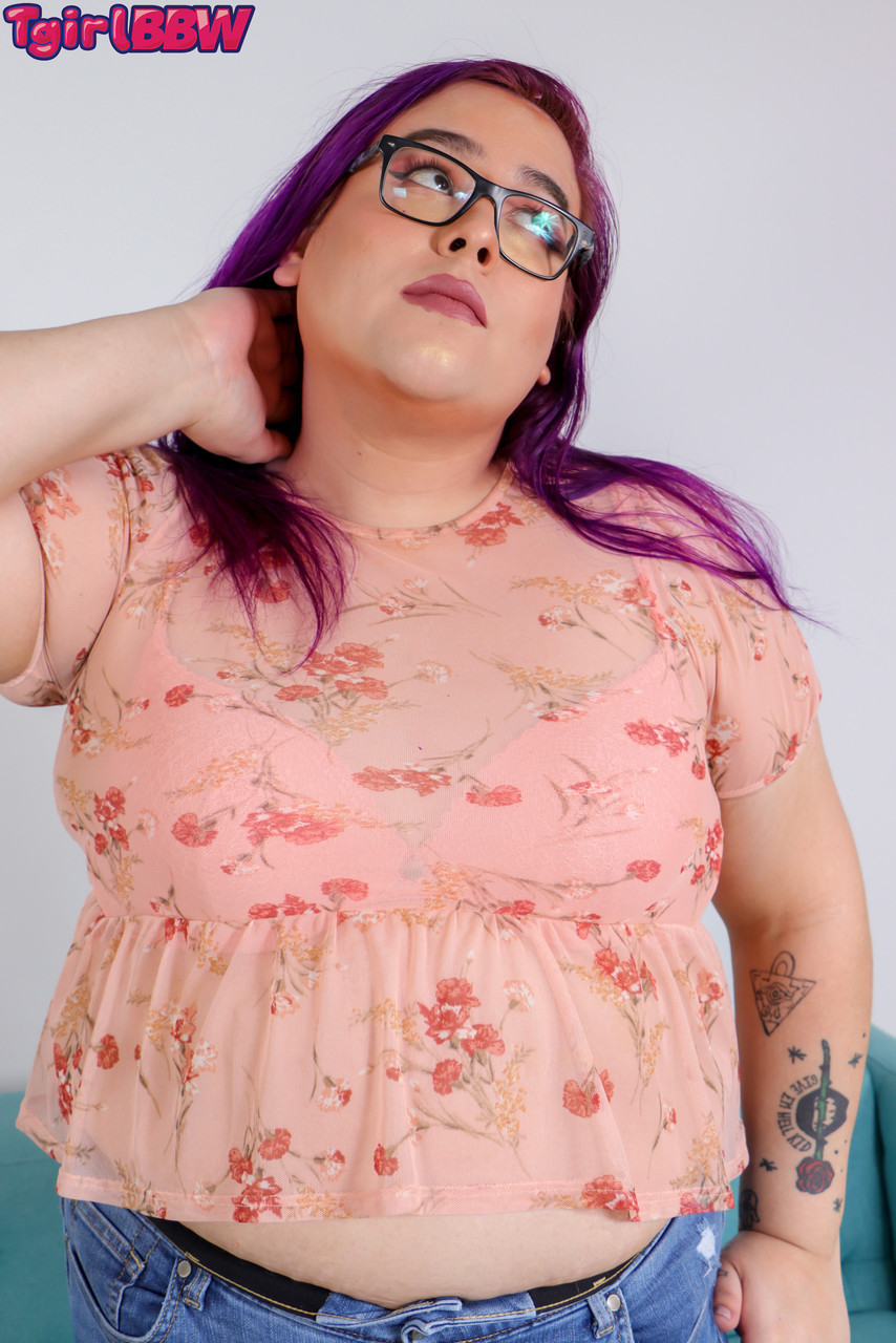 Nacktfotos der molligen TGirl-BBW Adriana Gonzalez, die dicke Transsexuellen-Kurven zur Schau stellt, fetter Shemale-Arsch in engen Jeans – reiner BBW-Tranny-Teaser.