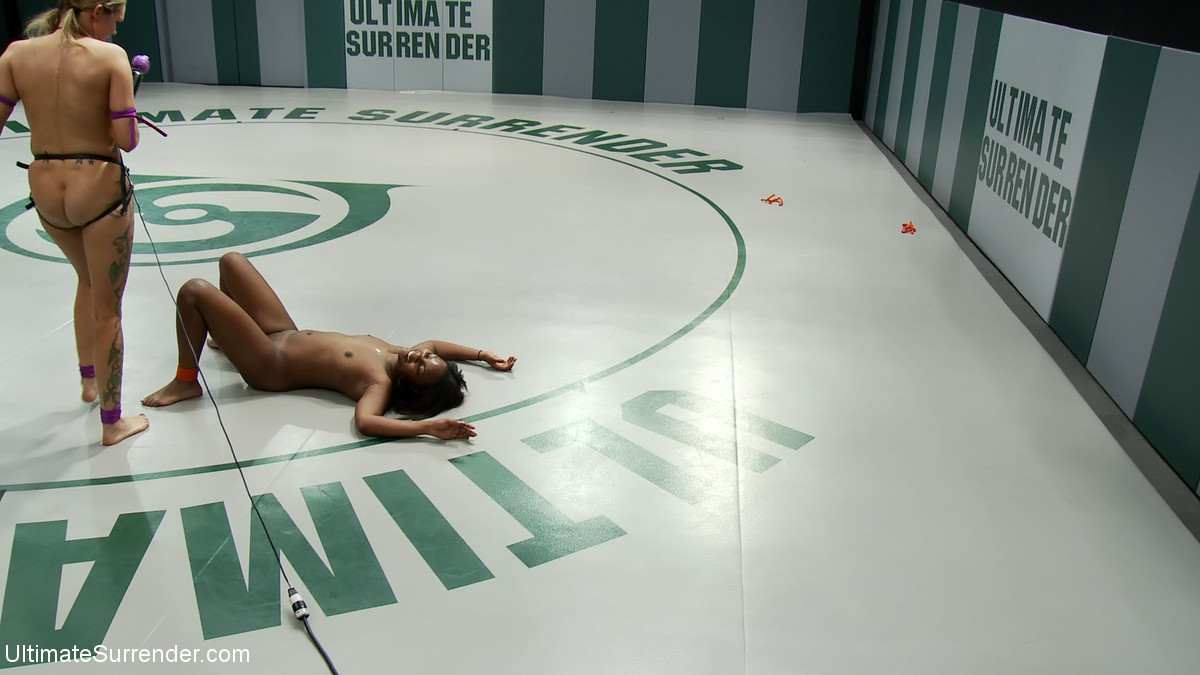 Coffee Brown and Rain DeGrey strip naked for an intense lesbian wrestling match, ending in bondage, facesitting, strapon fuck and BDSM surrender.