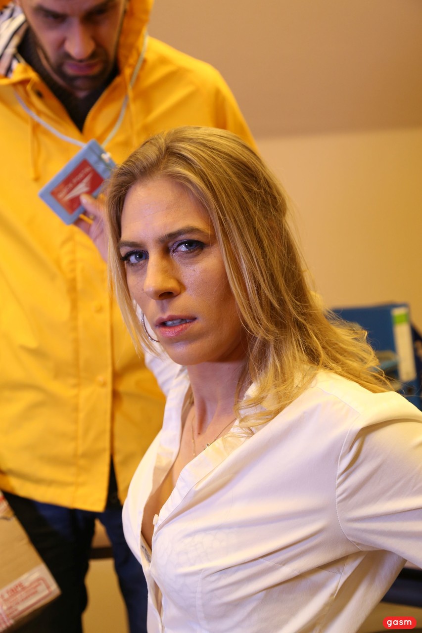 Watch Dutch office babe Jentina Small surprise-fucked by delivery guy: upskirt tease, panty fingering, stockings, handjob, huge cumshot, reality hardcore.