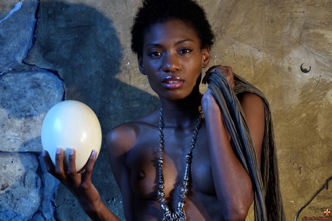 Dark Skinned Girl Jess Holds Large Egg While Modeling Butt Naked - Gallery Information