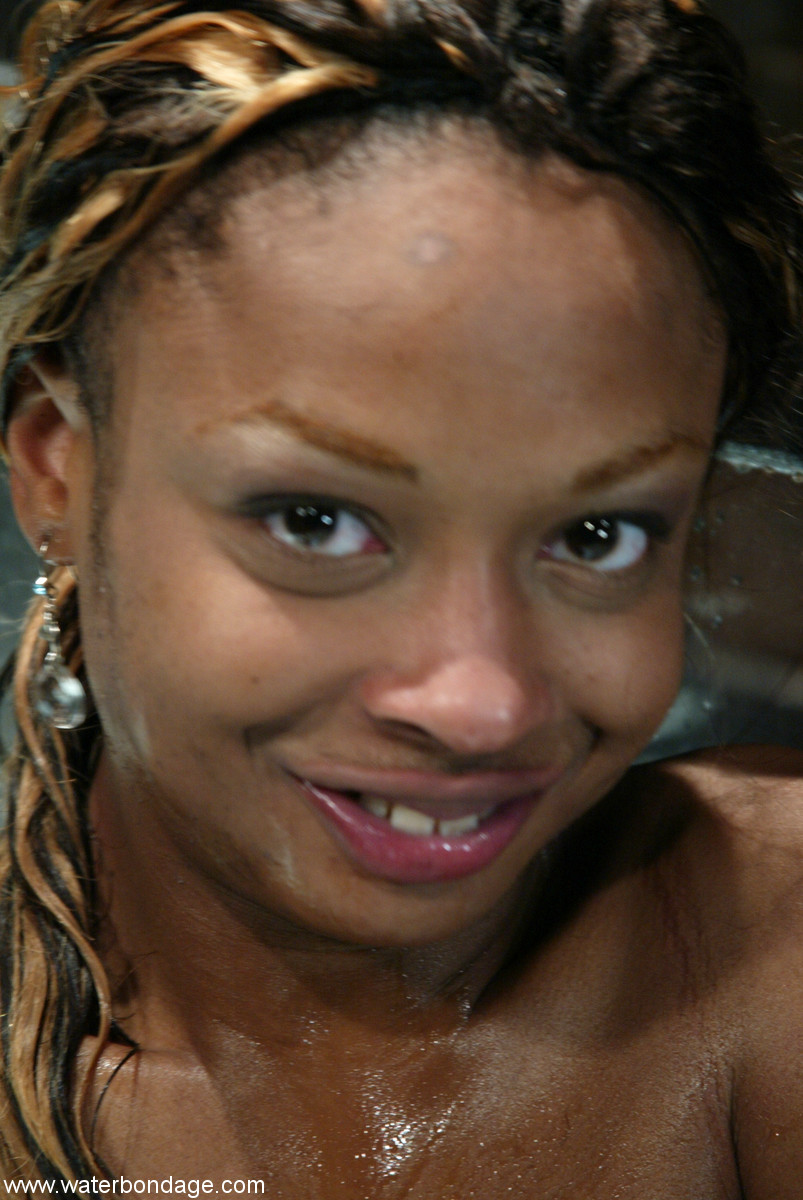 Ebony MILF Vixen Fyre submits to dripping water bondage, her glistening black skin, aching nipples and upturned face captured in fetish close-up for raw African BDSM thrills.
