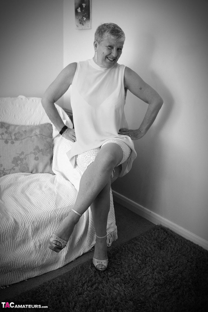 La madura Savana se abre en ligas y tacones, enseñando tetas caídas y bragas de abuela para fans porno amateur de más de 70.