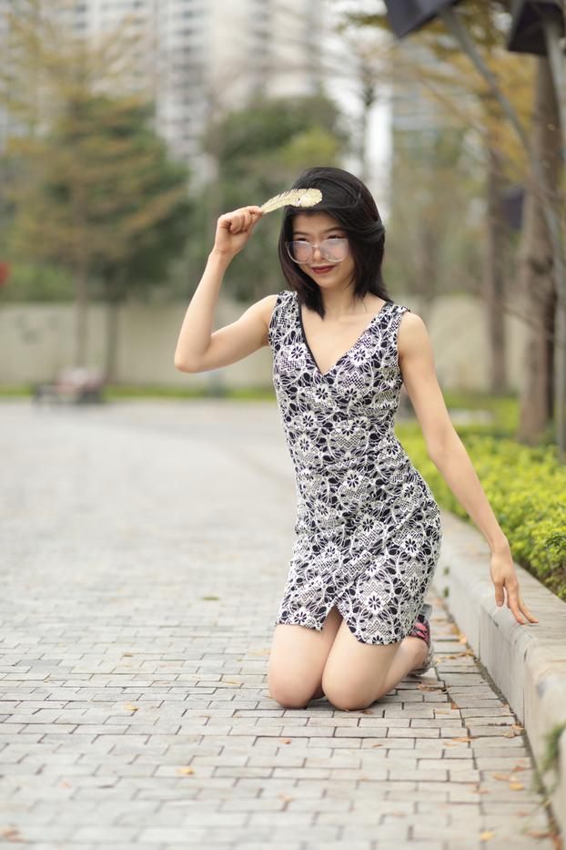 Chica asiática petite en vestido de verano y gafas enseña su cuerpo apretado en público, teen amateur traviesa de pelo corto y mirada sexy.
