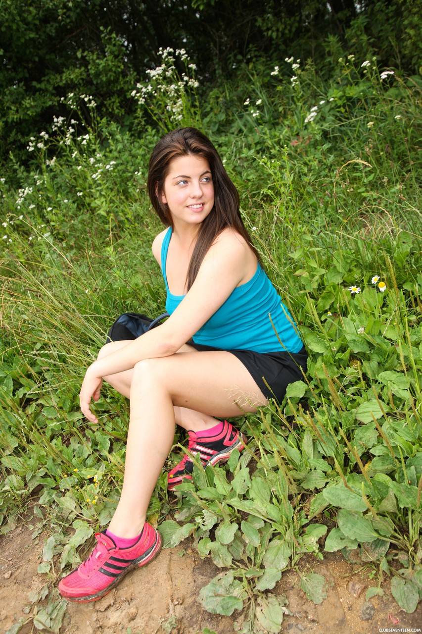 La adolescente británica Raven Cerna se desnuda al aire libre, se excita en falda y zapatillas deportivas antes de abrir su coño afeitado en un primer plano, en un disparo en solitario nudista.