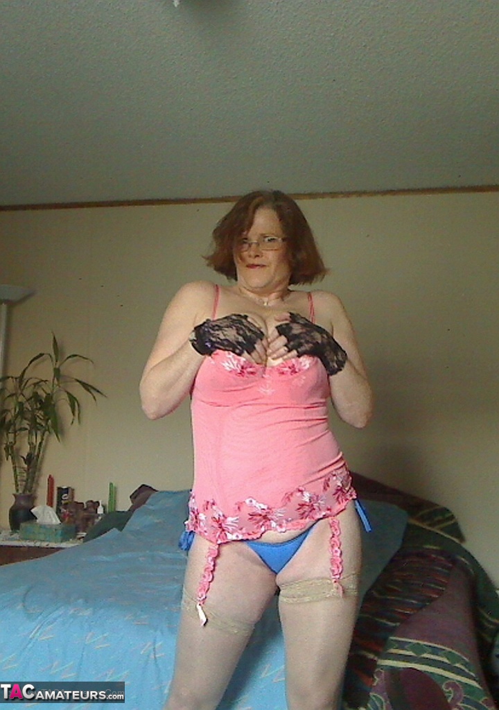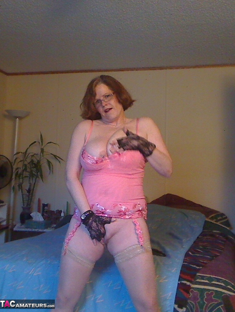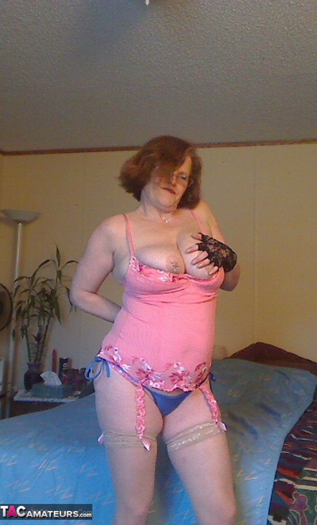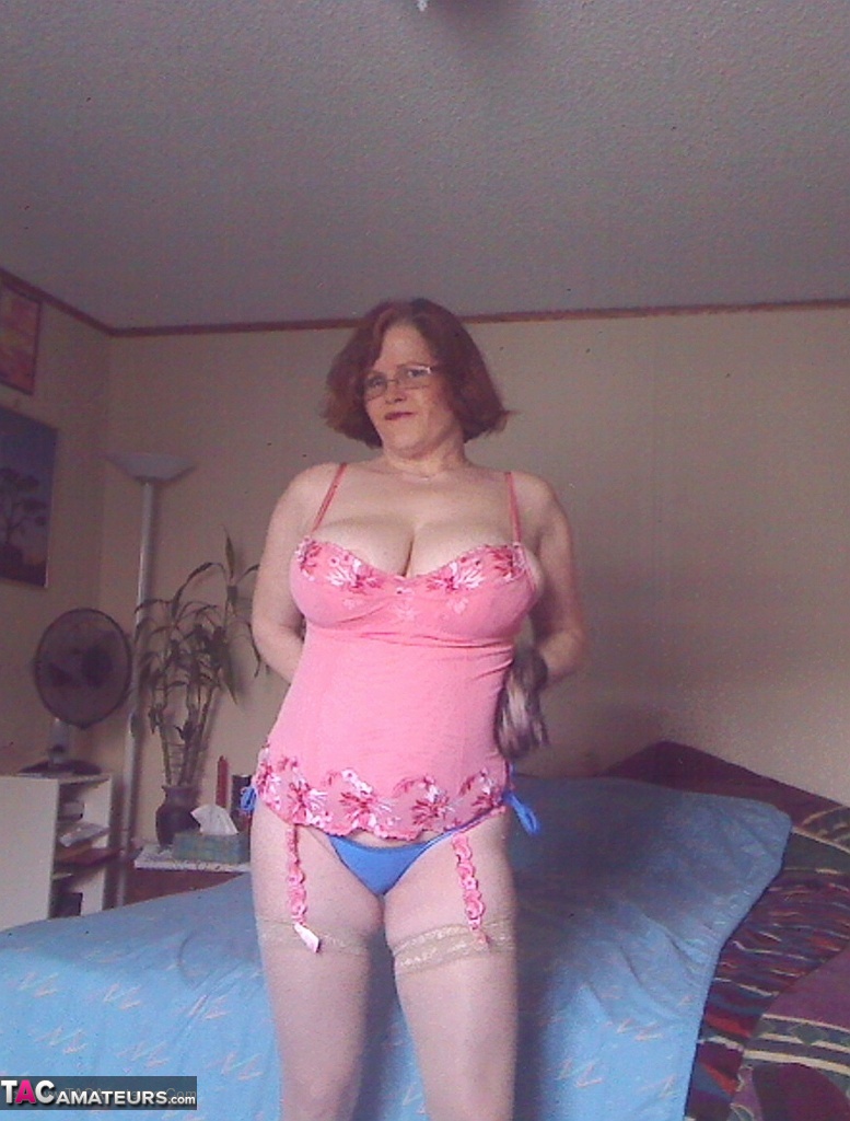 Madura pelirroja tetona amateur, Misha, se quita la lencería para enseñar sus enormes tetas y luego se folla la concha mojada con un consolador en liguero.