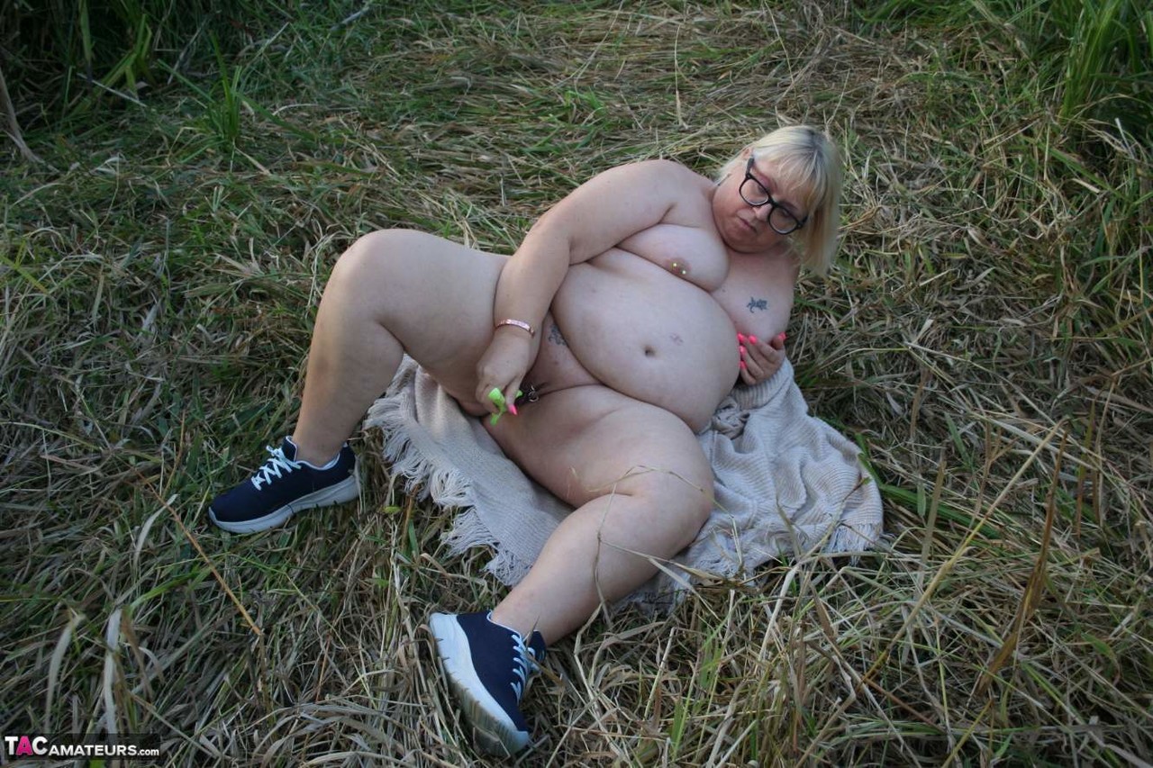 Mira a la MILF británica BBW Lexie Cummings desnudarse al aire libre, mostrando tetas caídas, curvas gruesas y diversión con pene pequeño en un escapada amateur en el campo.