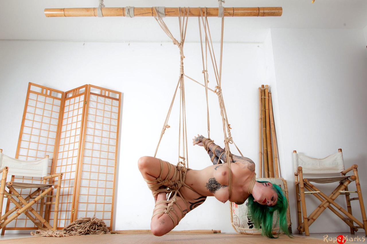 Chica Tatuada Suspendida Con Pelo Verde Desnuda En Cuerdas - Información de la Galería