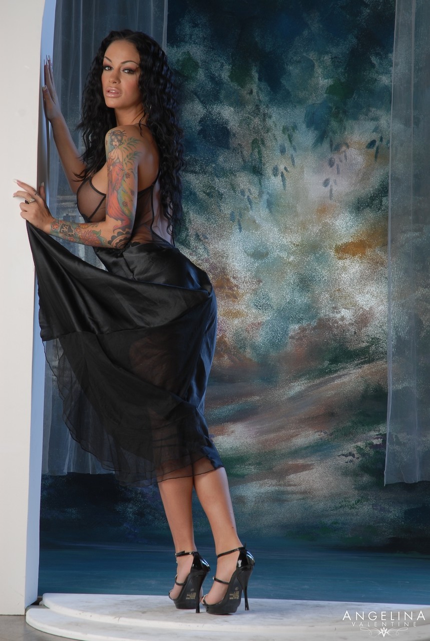 La MILF latina de piernas interminables Angelina Valentine se quita el vestido negro ceñido, provoca en tacones, luego posa desnuda alardeando de curvas tatuadas, culo enorme y tetas falsas grandes.