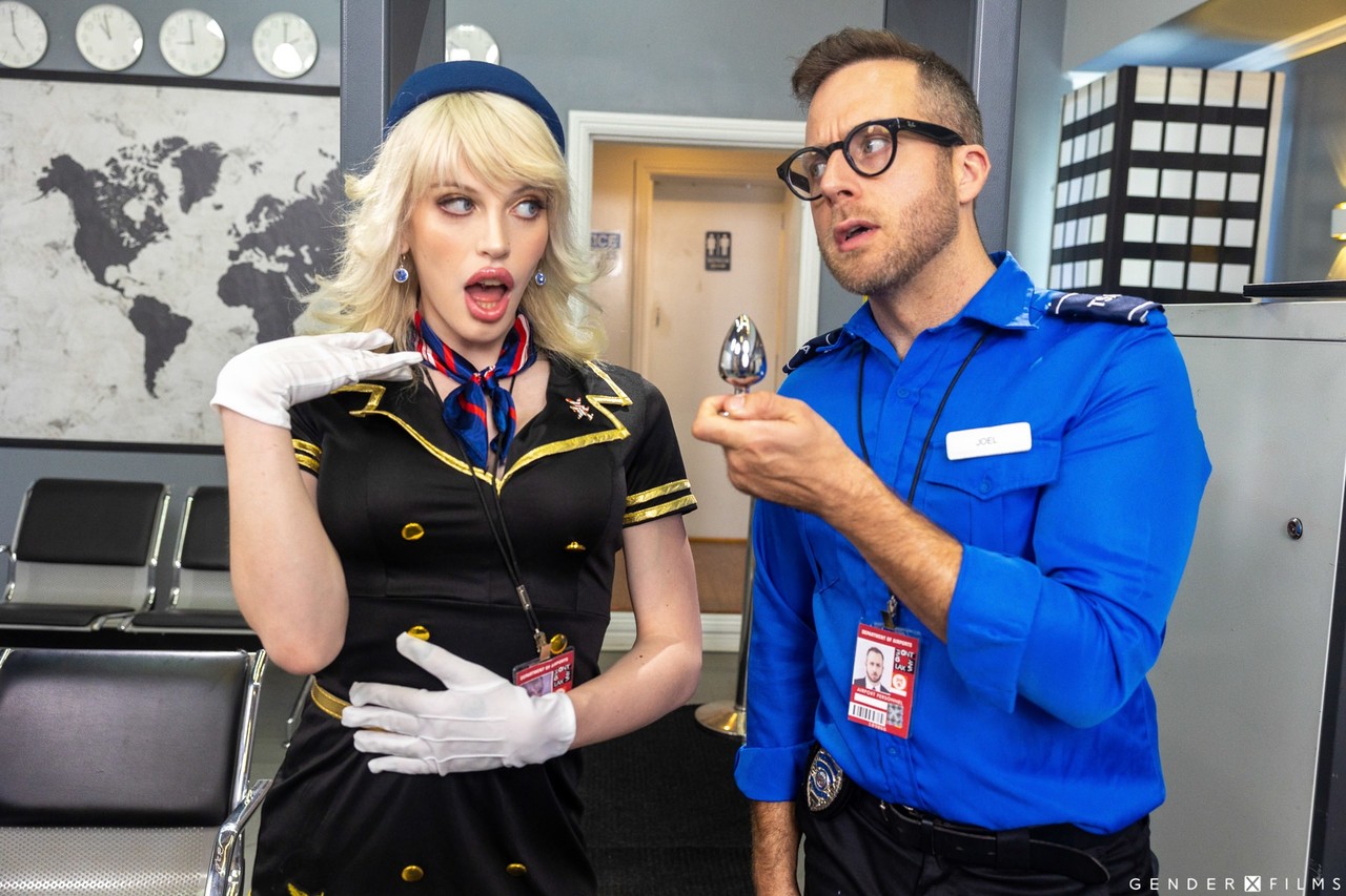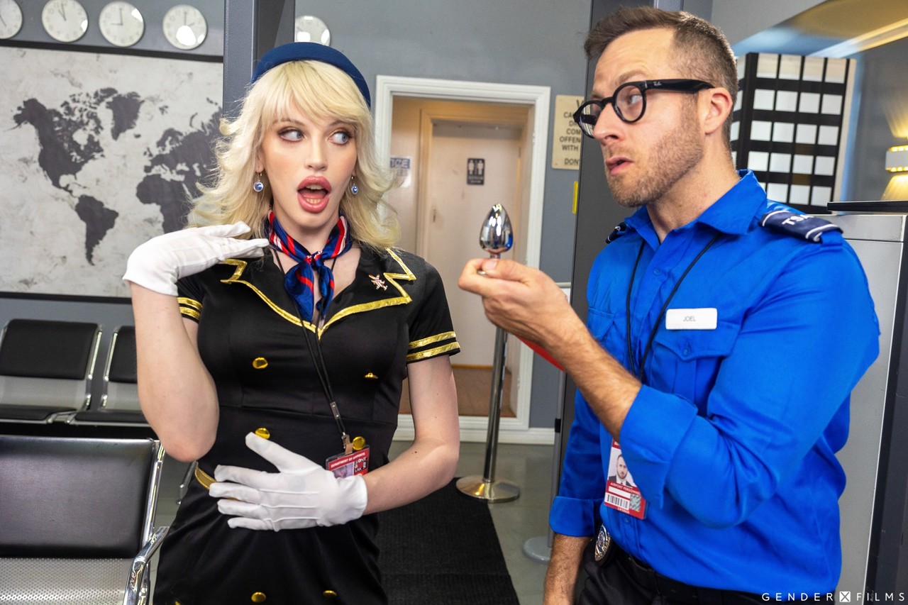 Izzy Wilde XXX: Chica transexual en uniforme, medias, tacones domina a un tío a pelo. Gender X Films ofrece acción hardcore sissy bareback.