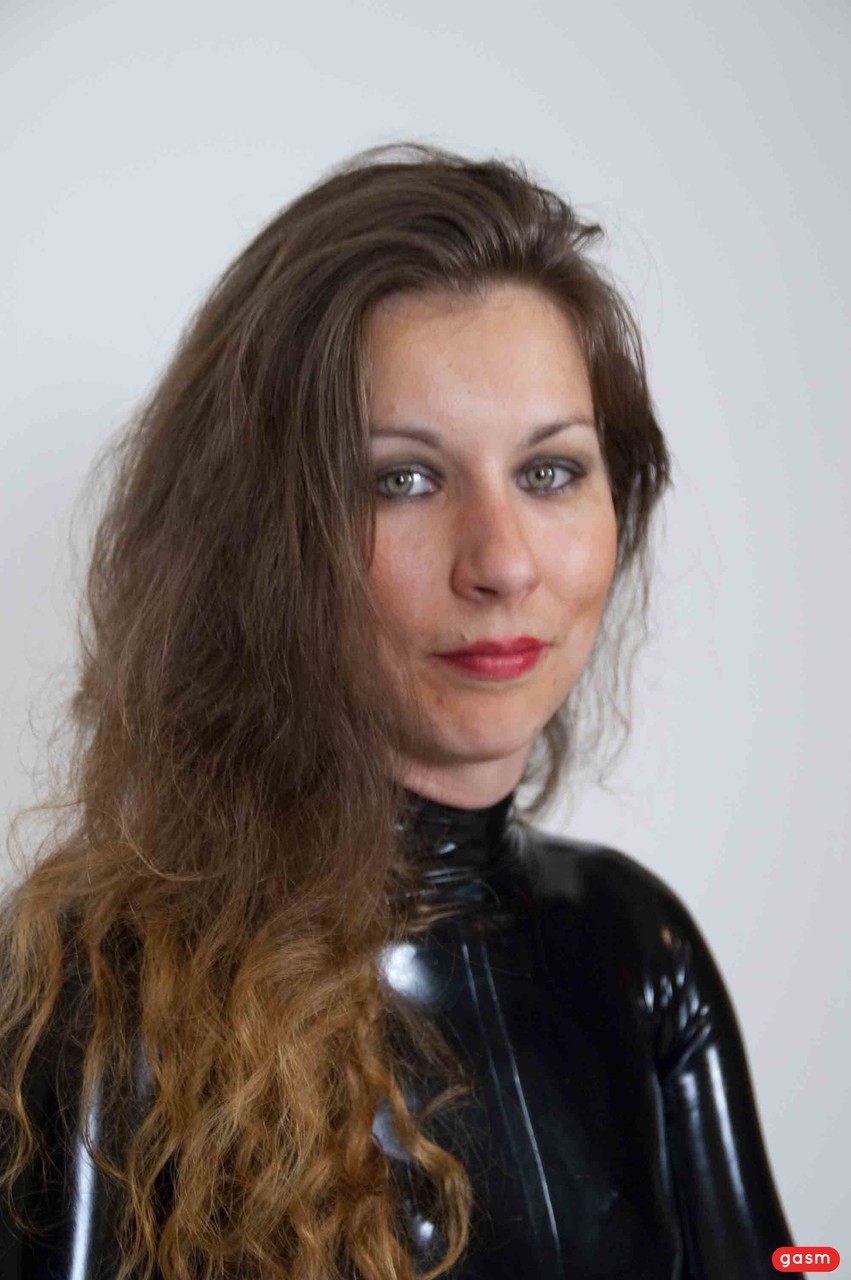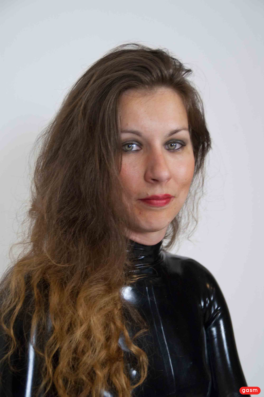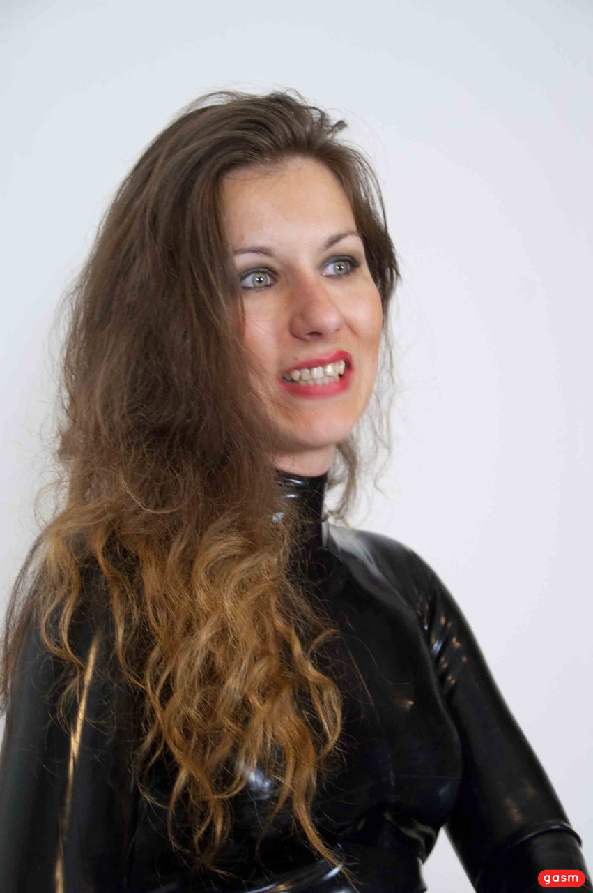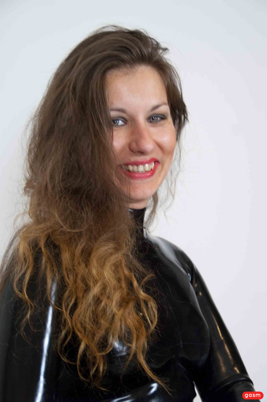 Dominant European mistress in shiny black latex teases her amateur male slave, sensually touching his exposed ass in this kinky femdom gallery.