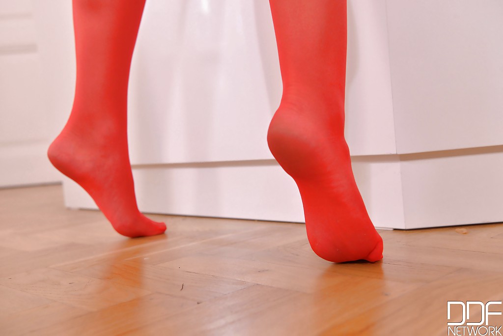 European brunette babe Lucia Denville teases in stockings and heels, flashing big tits, stocking feet, and bald kitty in a bent-over foot-fetish solo.