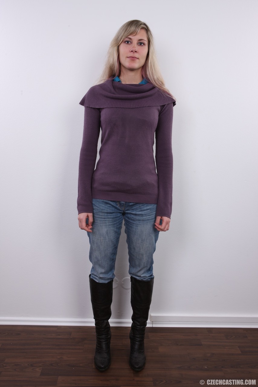 Blonde Czech beauty Michaela strips naked, spreading her hairy pussy and tight asshole in solo erotica. Small tits, big nipples, see-through panties tease.