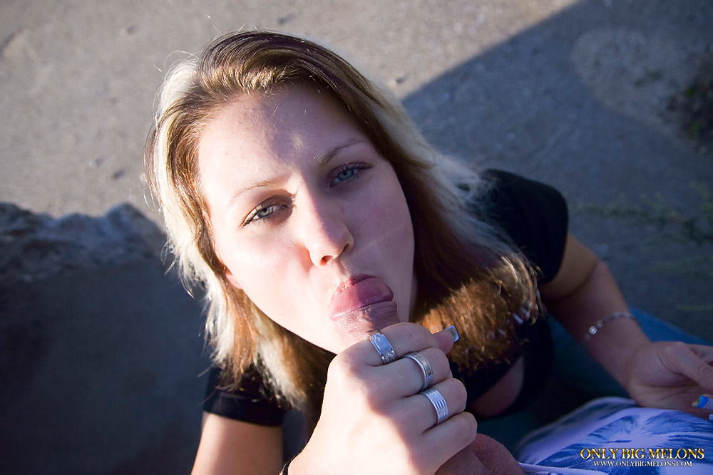 Busty blonde teases in tight jeans, flashing big tits outdoors before dropping to her knees for a sloppy POV blowjob, titjob and facial finish.