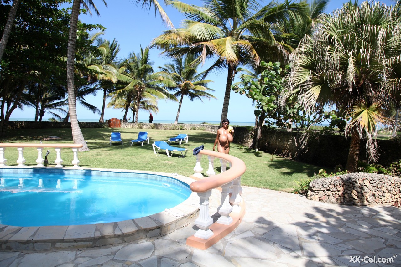 La BBW latina Kristina Milan dévoile ses énormes seins naturels de MILF au bord de la piscine, huilant ses généreuses courbes pour une exhibition amateur extérieure plantureuse.
