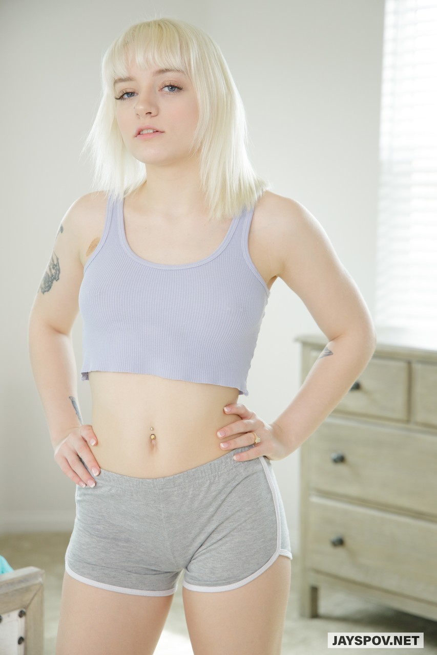 Petite blonde Naomi Nash taquine en short moulant, exhibant ses jolis seins et son ferme petit cul lors d’un strip de casting qui célèbre son corps tatoué et ses baskets.