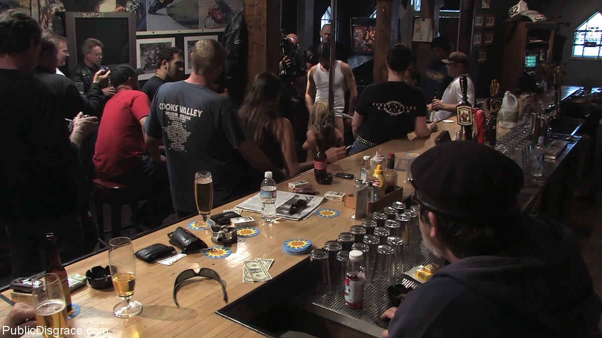 La blonde Harmony se soumet à Mark Davis dans une galerie BDSM publique choquante : bondage en plein air, fellations brutales, chatte exposée, humiliation publique intense capturée.