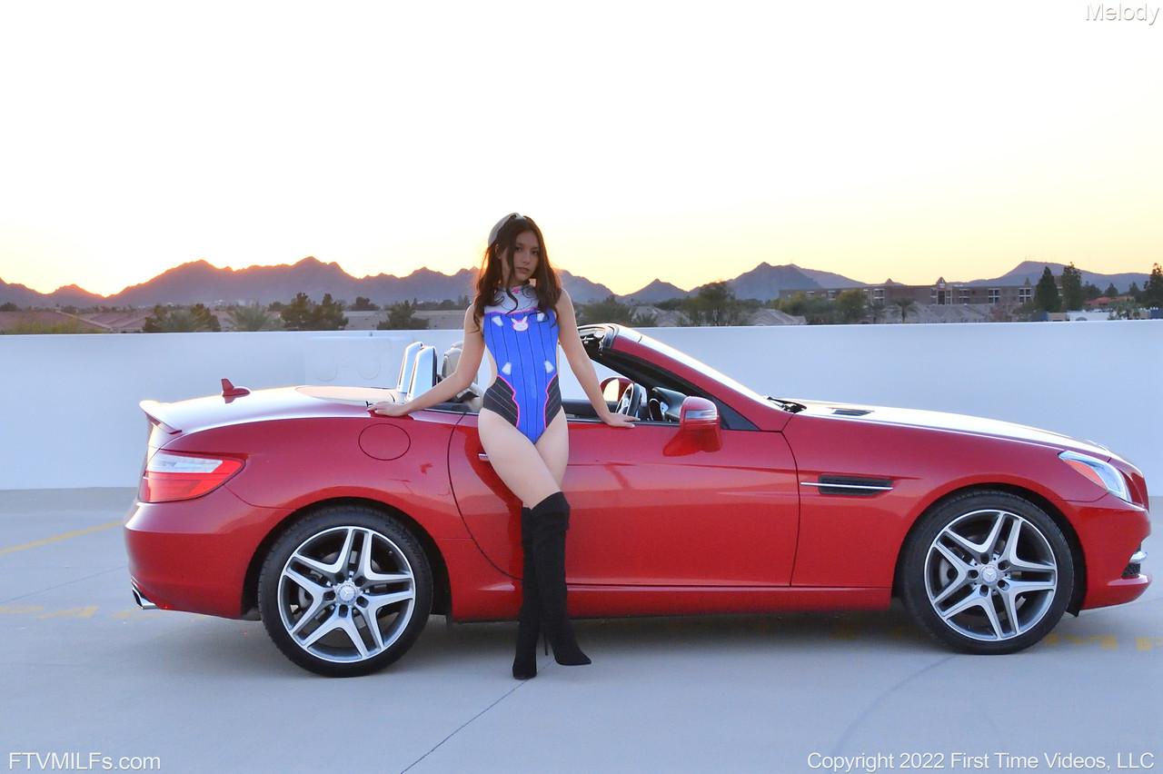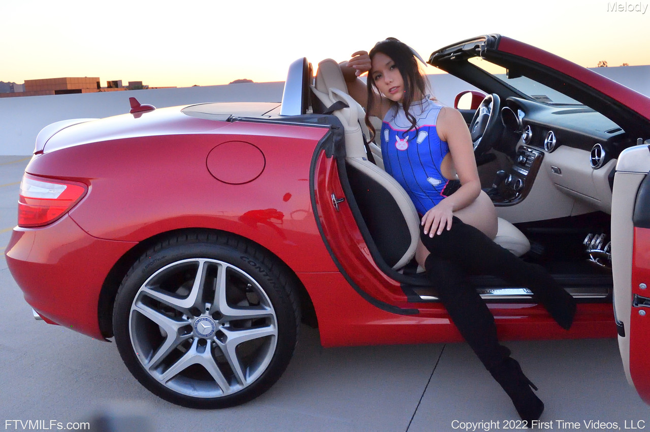 La fille amateur de cosplay Melody expose son costume et son corps nu chaud dans une voiture de sport, en écartant les jambes avec des talons hauts, taquinant avec une masturbation solo en plein air avec un gode.