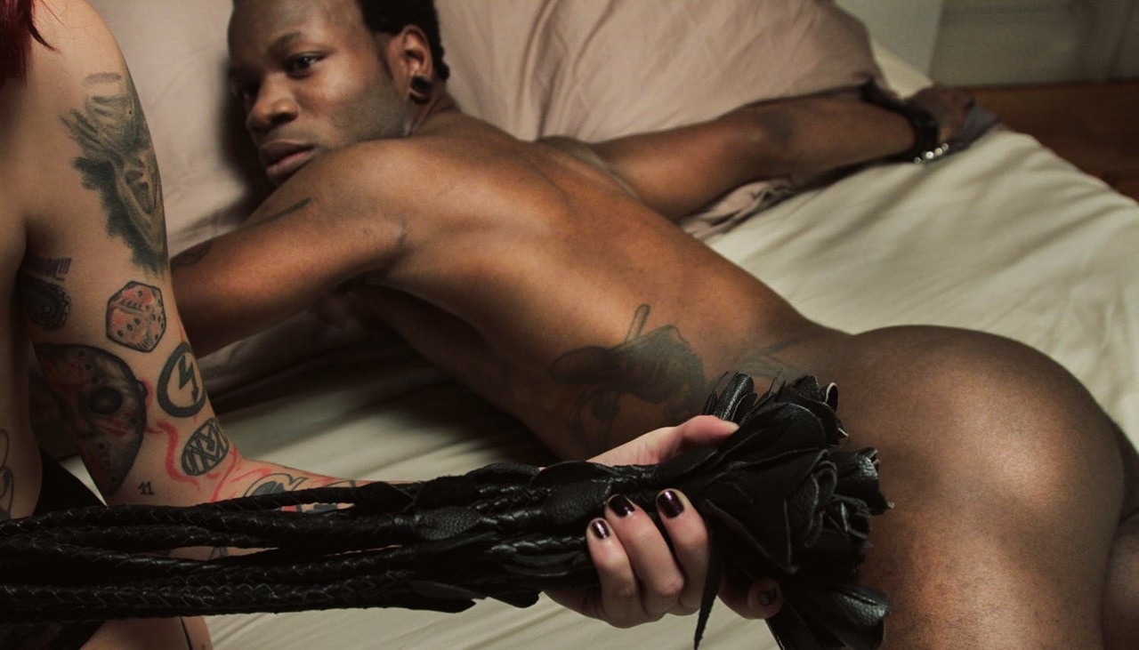 Silvia Rubi domine un esclave noir attaché dans une intense séance de bondage femdom, fouetté sur le lit par une maîtresse rousse dans un jeu de pouvoir BDSM.
