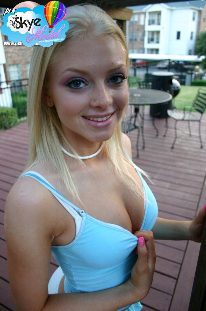 La blonde amatrice Skye soulève sa mini-jupe sur la terrasse, offrant un regard coquin sous sa jupe sur son serré petit cul de teen dans une taquinerie sexy habillée.