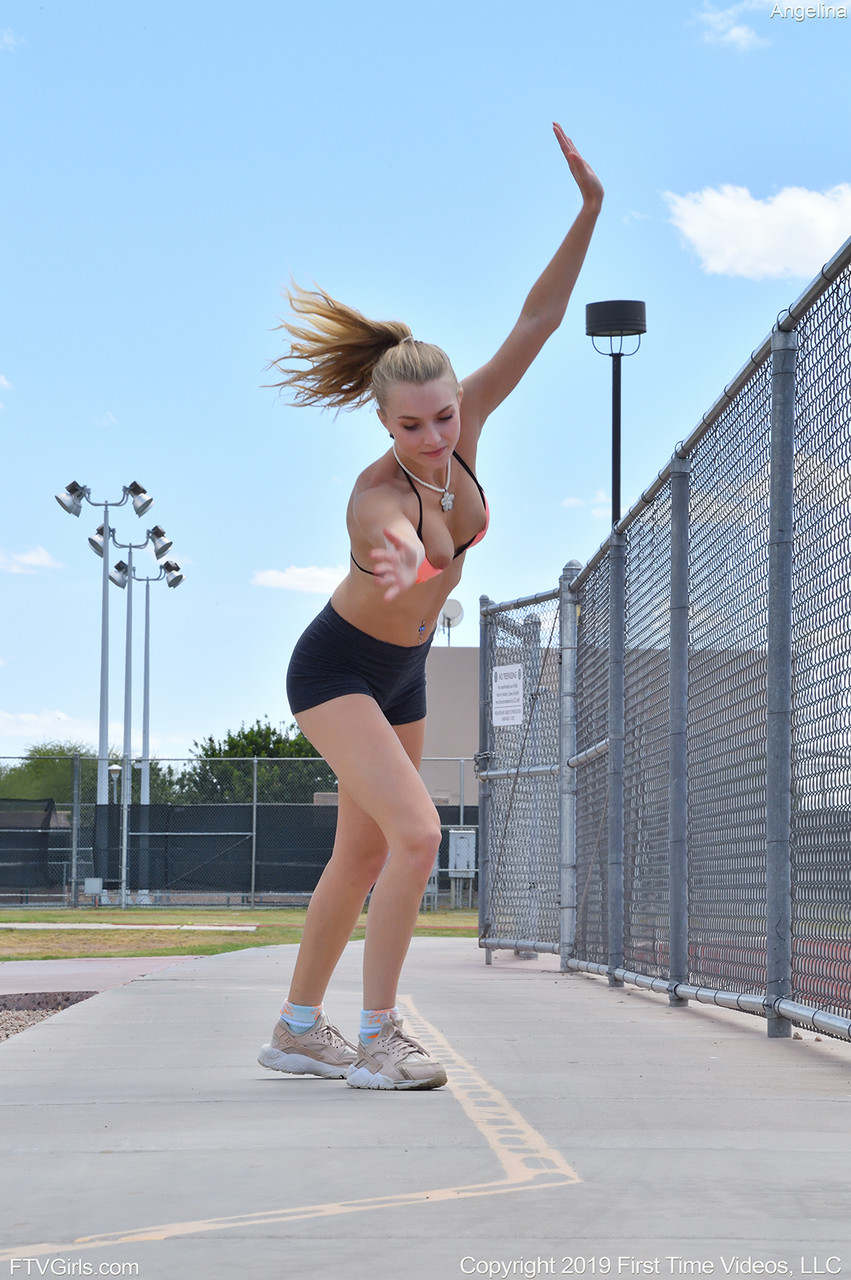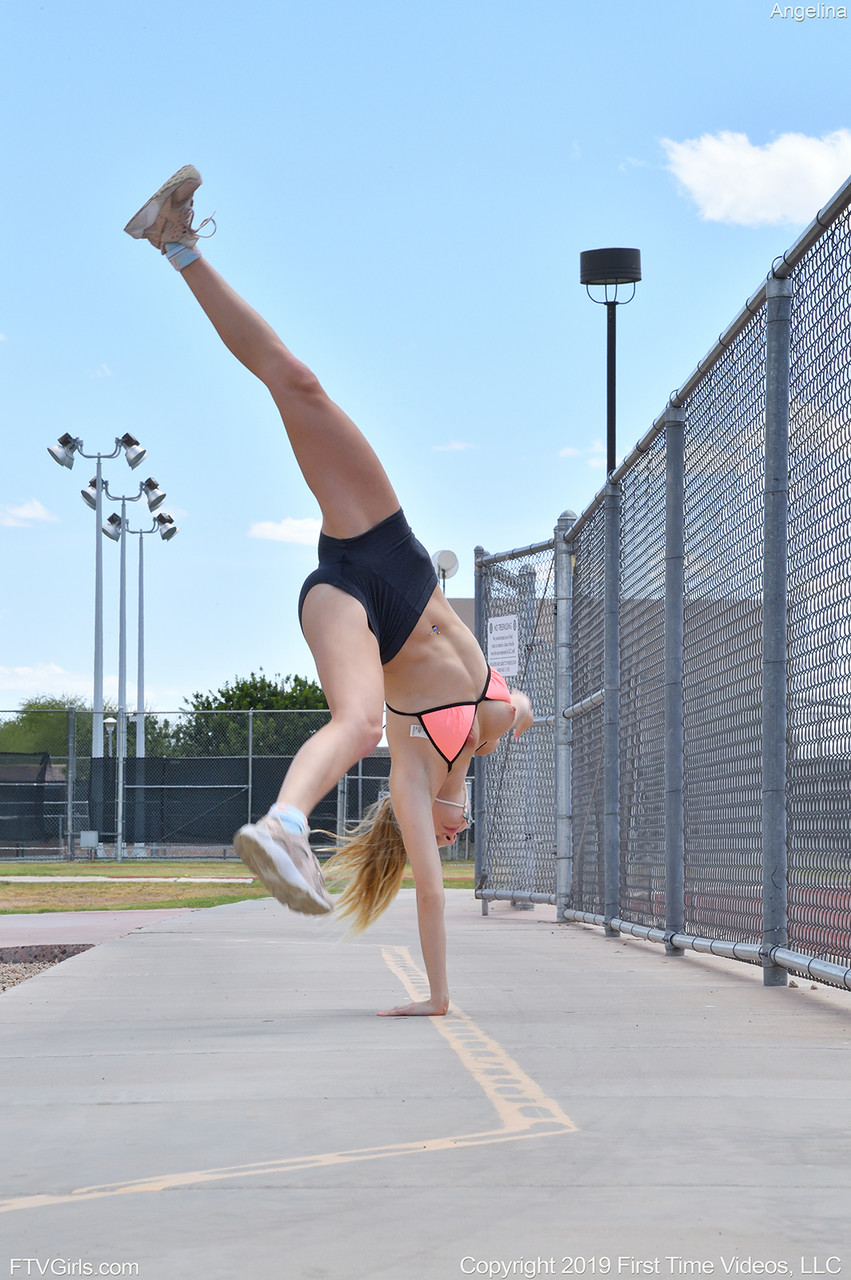 La blonde adolescente Angelina expose son corps de bikini sportif, montrant ses fesses serrées et sa chatte lisse dans un entraînement en plein air audacieux en public.
