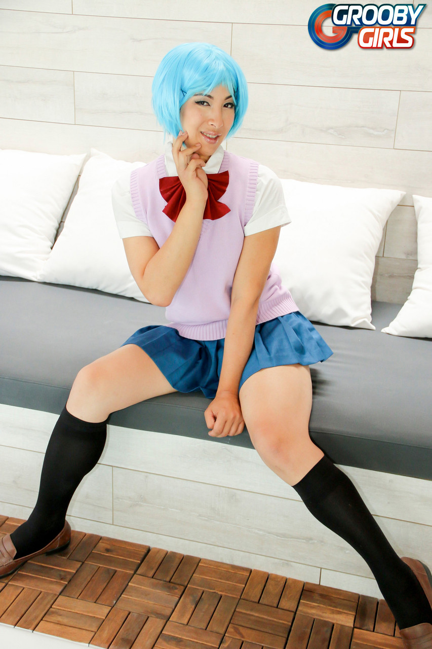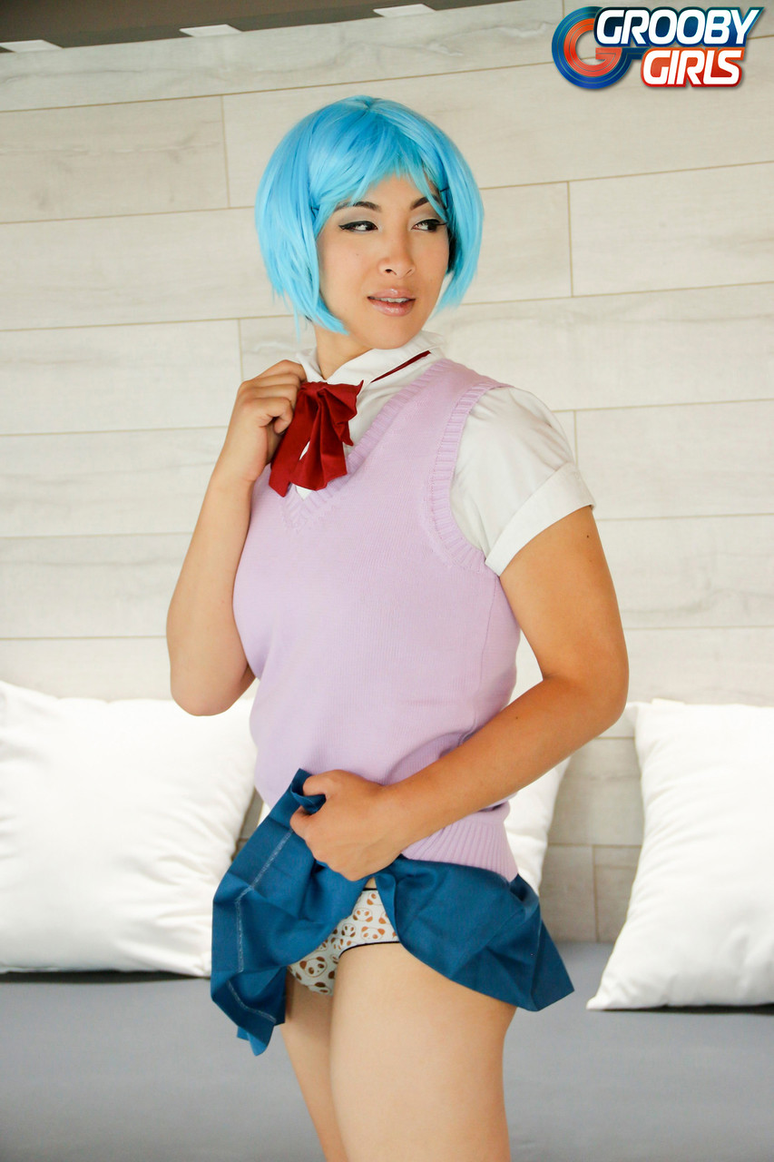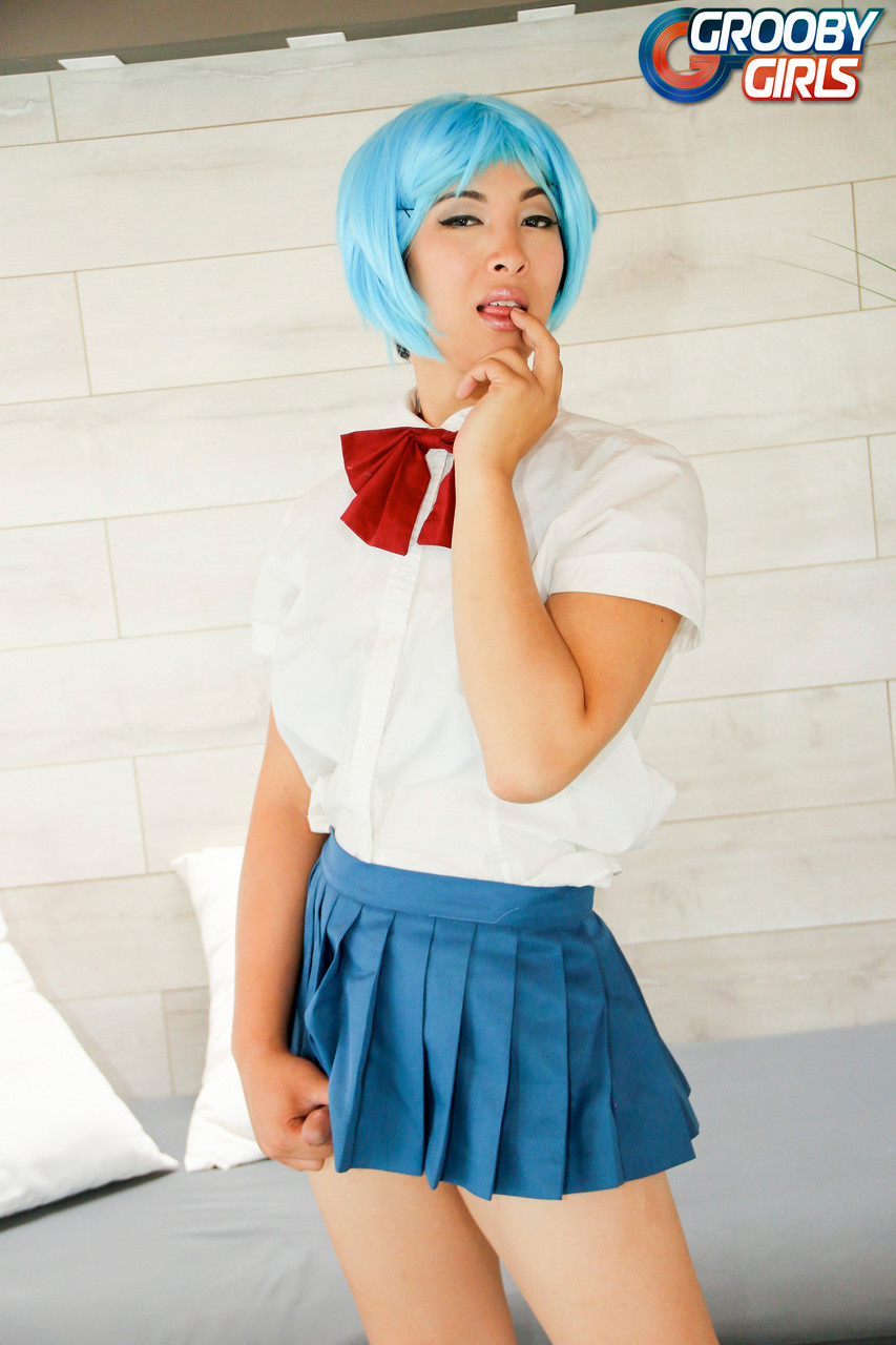 La transsexuelle asiatique aux cheveux bleus Natalie Chen soulève sa jupe, dévoile une énorme érection à travers sa culotte en dentelle, puis enlève son uniforme pour branler son énorme bite dans un show d’upskirt ladyboy.