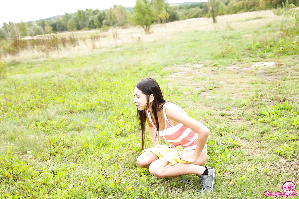 Young barely legal teen babe flashes perfect big natural tits outdoors, teasing with shaved pussy, see-through panties, and golden pee in close-up.
