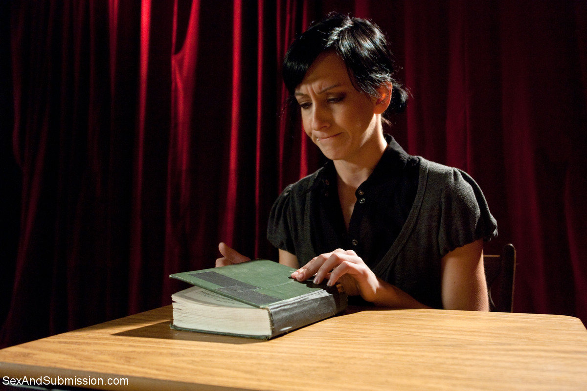 Sultry brunette MILF dives into kinky BDSM bondage on her first brothel shift, dominating as a naughty schoolgirl in this steamy adult gallery.