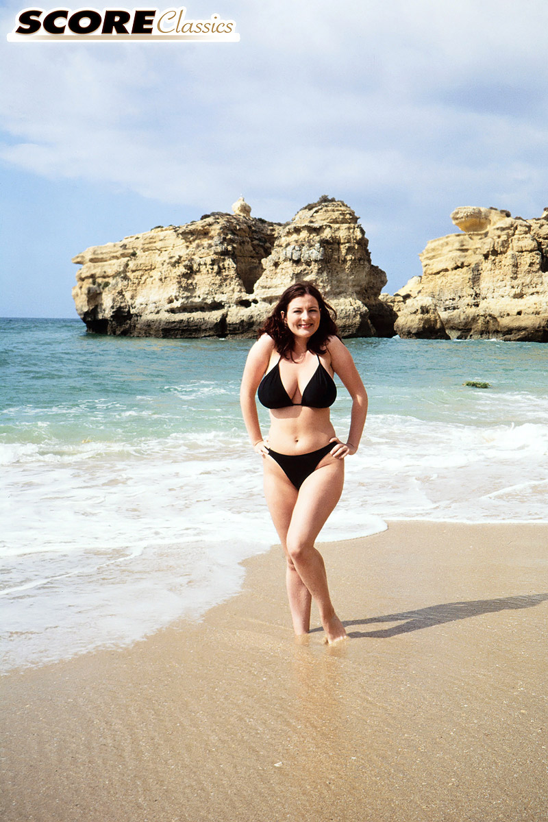 British brunette MILF Lorna Morgan unleashes her big natural tits from a tiny bikini on a wet beach, spreading and teasing outdoors for mature lovers.