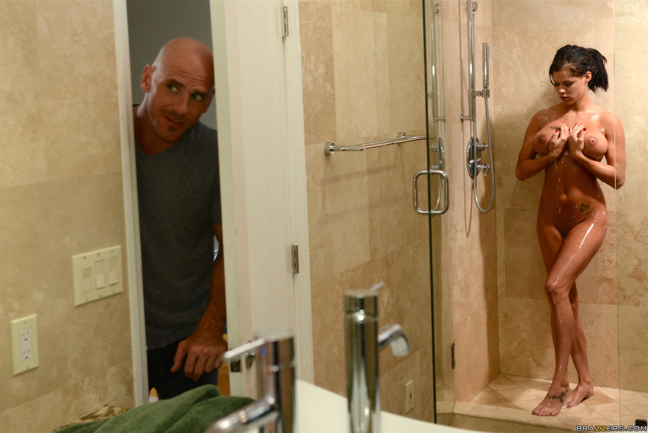 Busty Peta Jensen rides Johnny Sins’ big cock in steamy shower, swapping positions for a dripping facial on her huge fake tits.