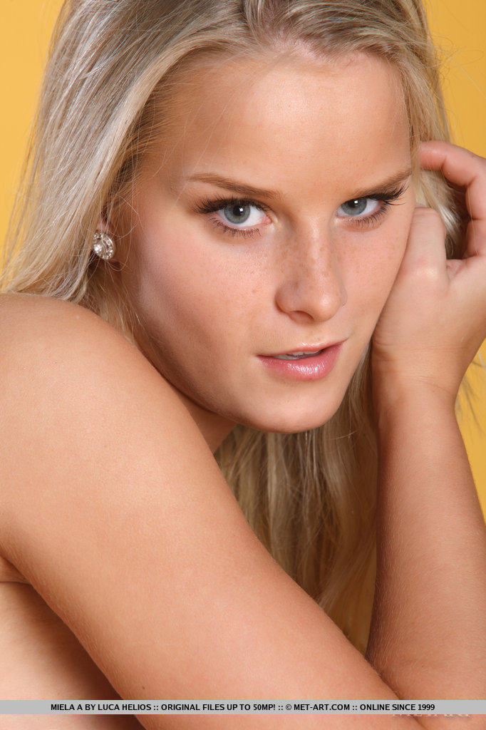 Blonde beauty Miela A strips to sheer lingerie, spreading wide to flaunt her big, natural breasts and perfectly tight, hairy pussy in intimate close-up.