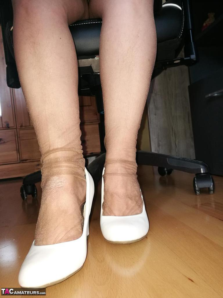 Sultry 70+ granny in back-seam nylons and glasses spreads hairy pussy under office skirt, masturbating with sharpie in amateur Euro secretary fantasy.