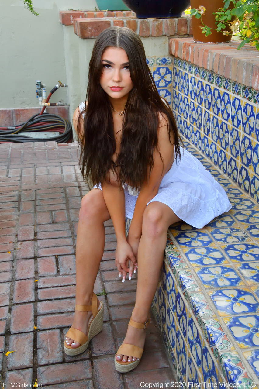 Long-haired American glamour teen Aria teases with daring public upskirt flashes, revealing white panties and pantyless moments outdoors.