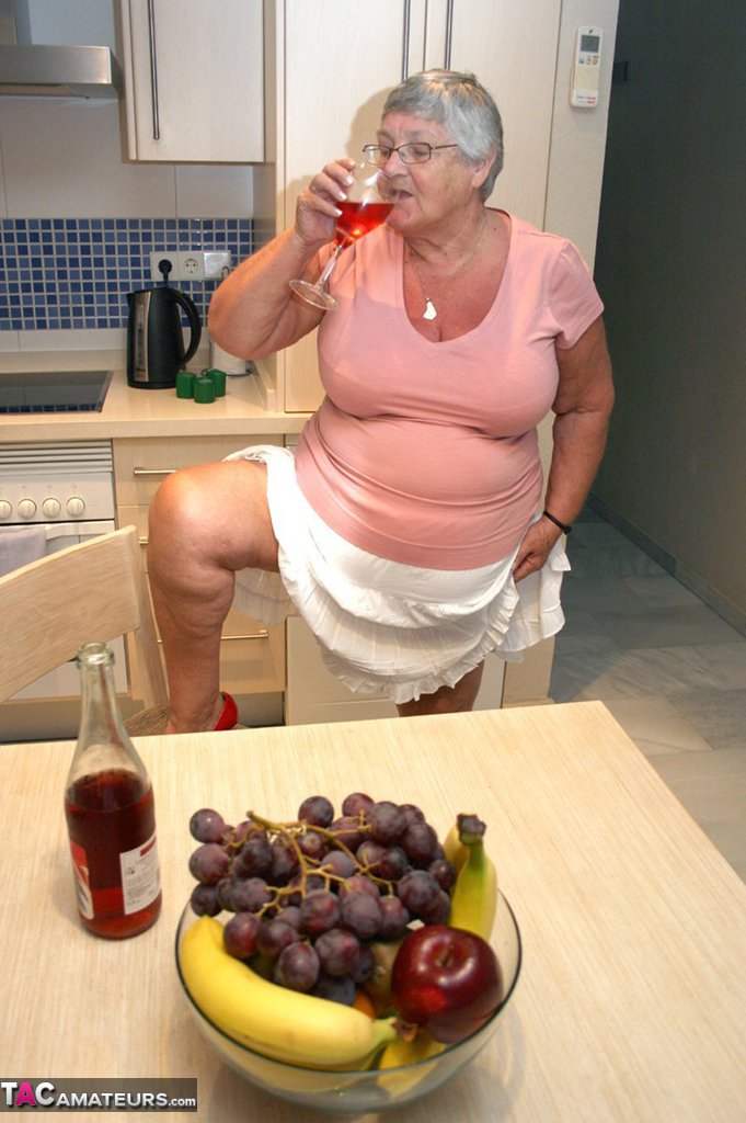 British granny Libby, 70+, peels off lacy lingerie in her kitchen, pours wine and curves her SSBBW body before playful toy fun.