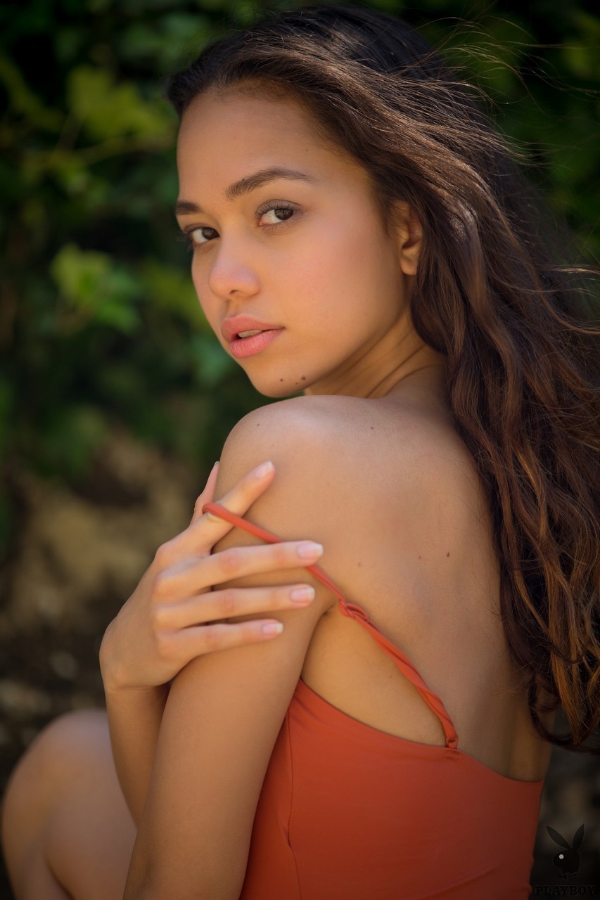 Petite Filipina beauty Kit Rysha bares her tiny breasts in sunlit outdoor glamour shoot, a stunning Asian centerfold solo.