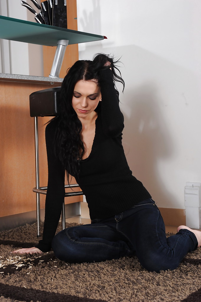 Home Jeans Raven Haired Beauty Hooovered Spreads Her Bald Pink Gash Wide