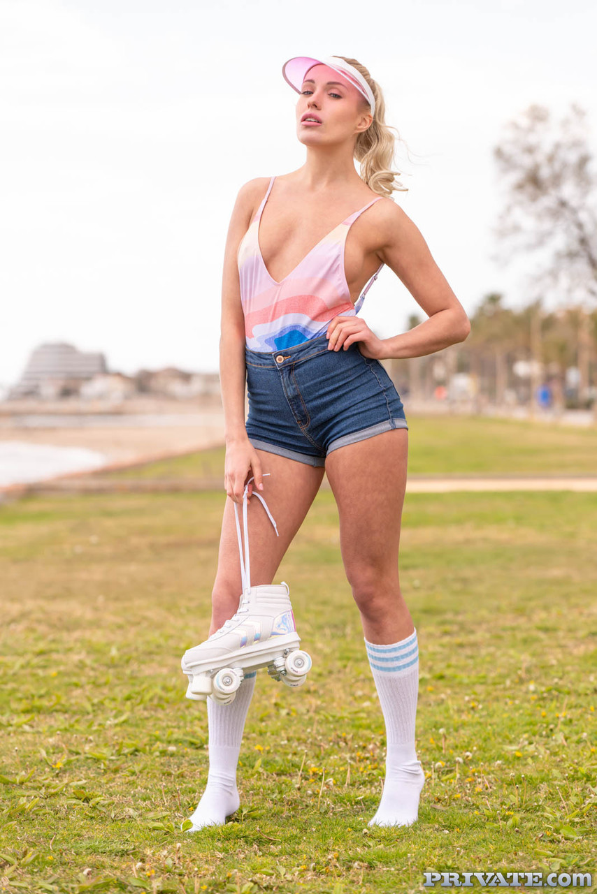 Sweet Ukrainian blonde Angelika Grays flaunts tiny tits outside before taking teen double penetration and anal debut.