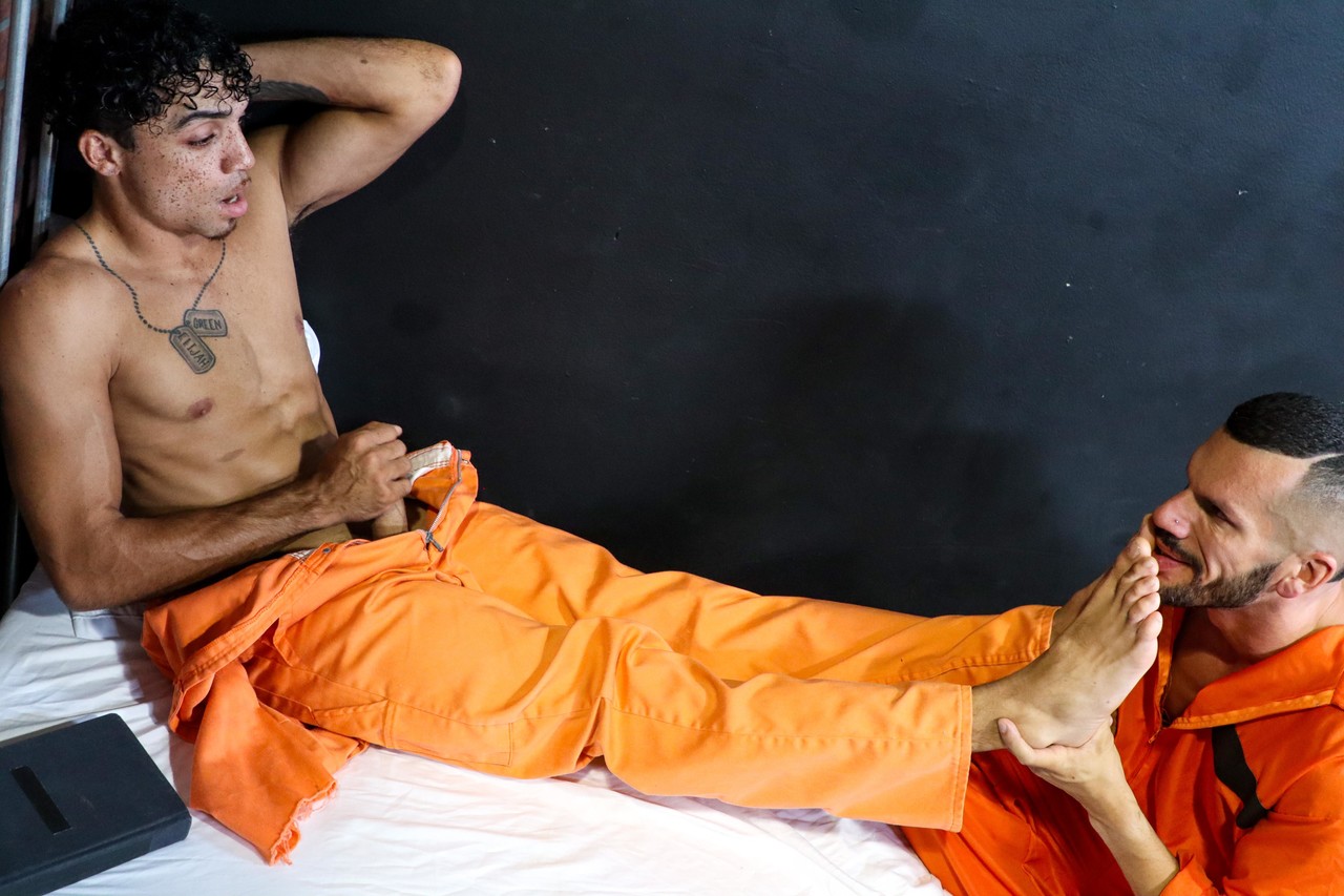 Gay prison fetish: Marco Lorenzo and Amone Bane share steamy foot worship, toe-sucking, and bare soles in a locked cell.