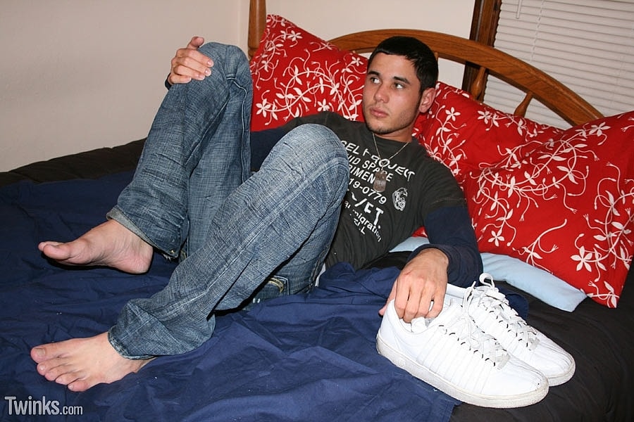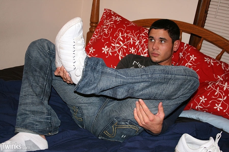 Hung twink Joe Y strips naked on bed, flaunting big balls and sexy gay feet in steamy solo show.