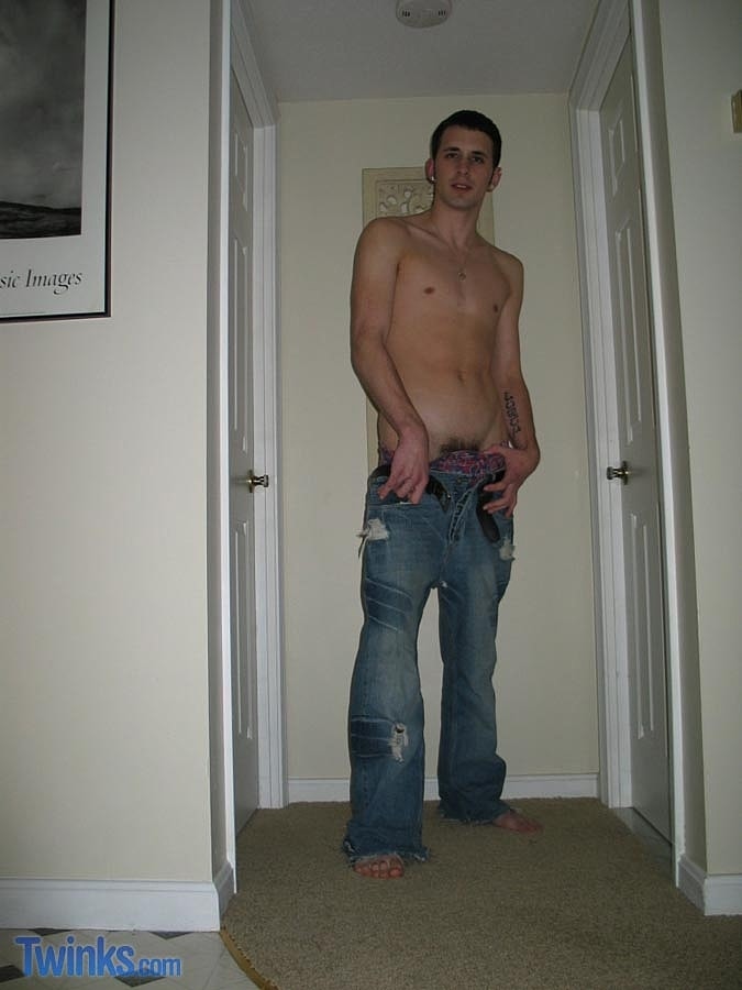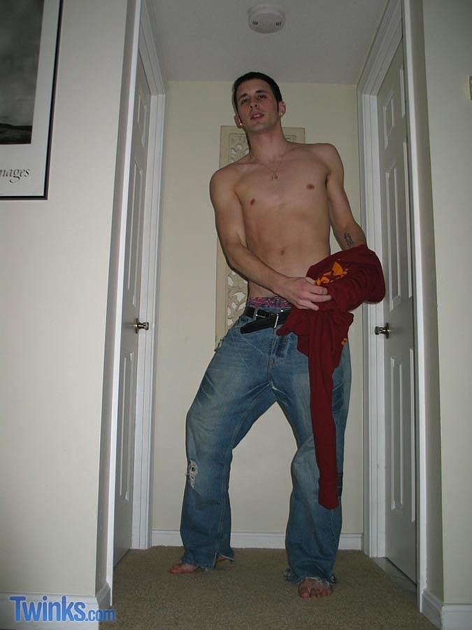 Shaved-headed gay twink Nate L strips in the hallway, flaunting big cock in steamy solo JO session.