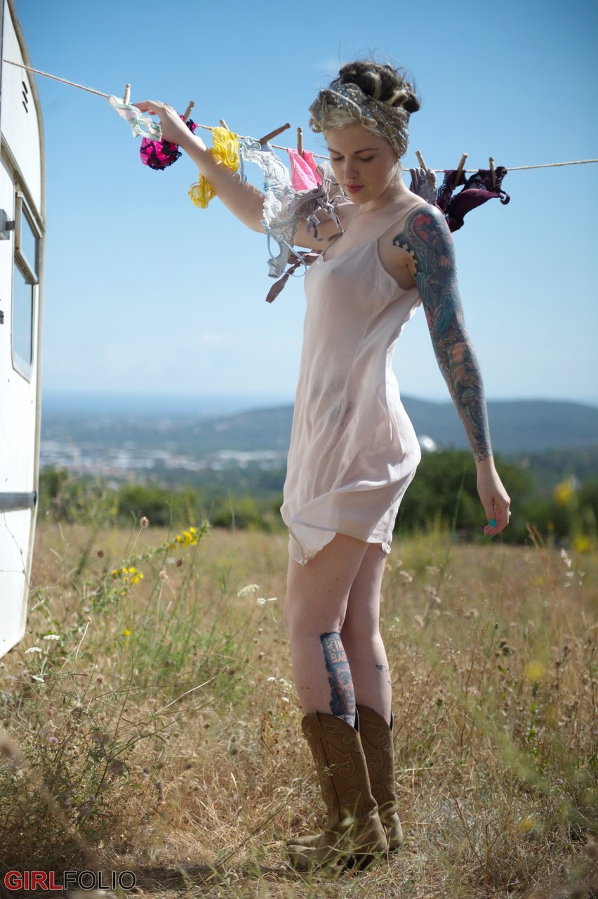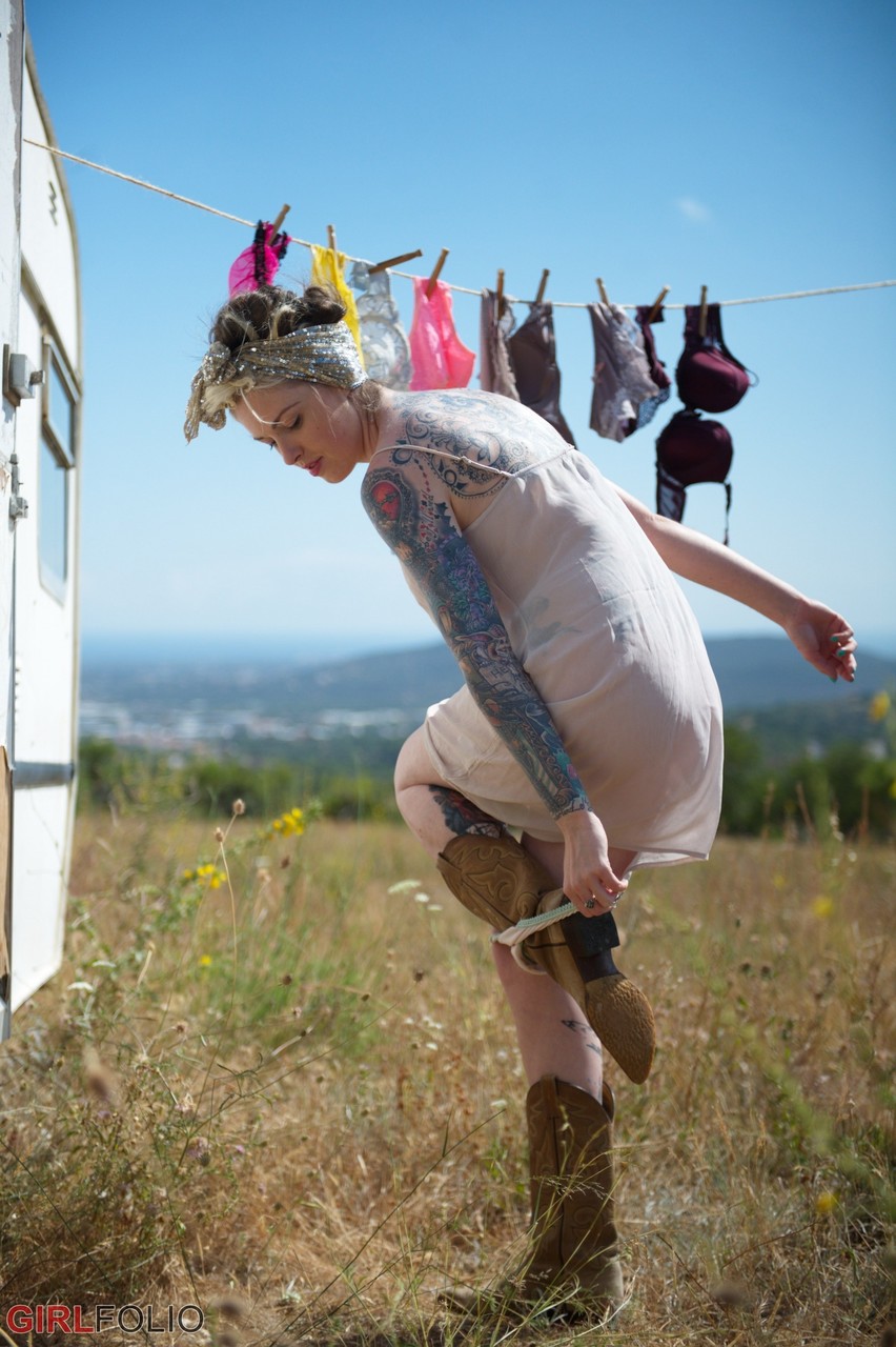 Tattooed British babe Anna Quinn teases in sheer nightie, flashing big tits and booty outdoors before stripping to kinky boots.