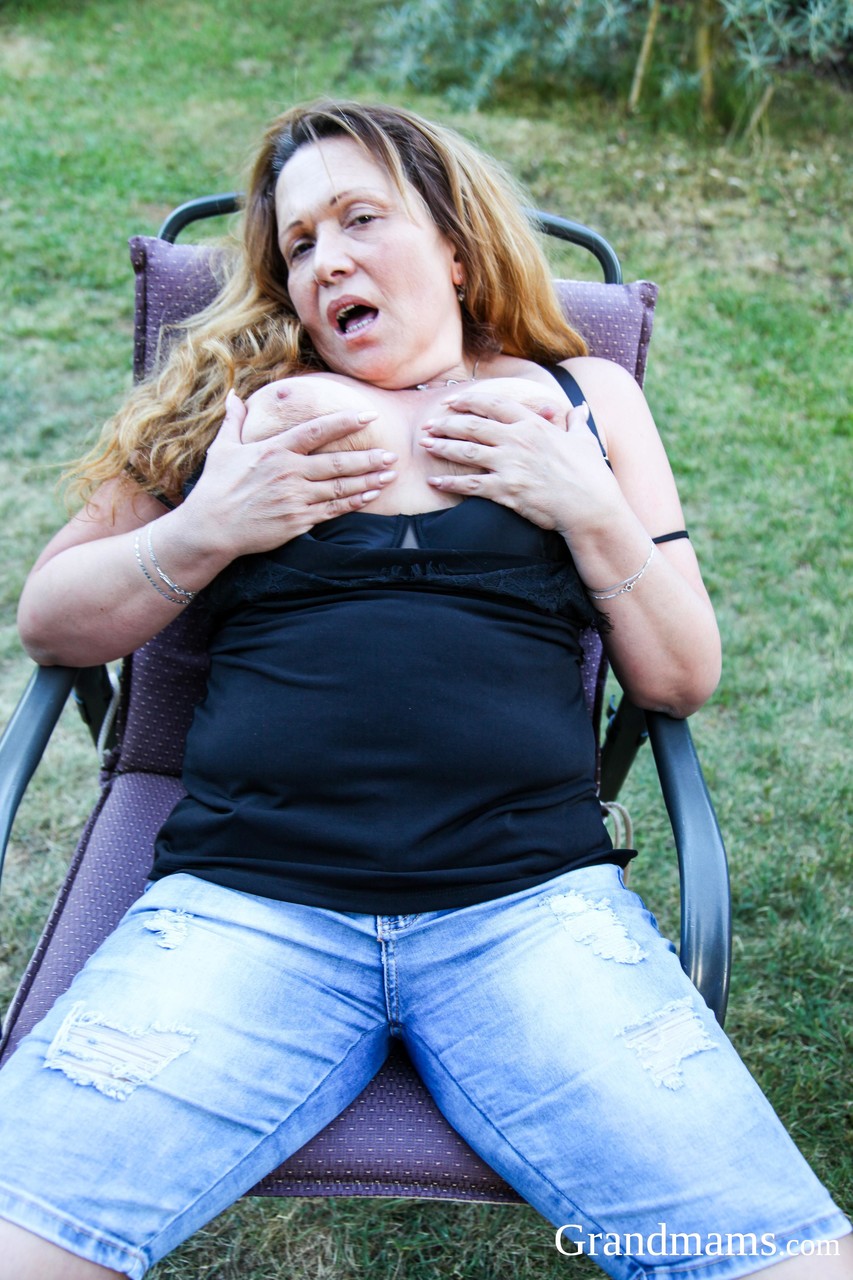 Busty mature blonde granny strips outdoors, spreads and fingers her wet cougar pussy in hot solo action