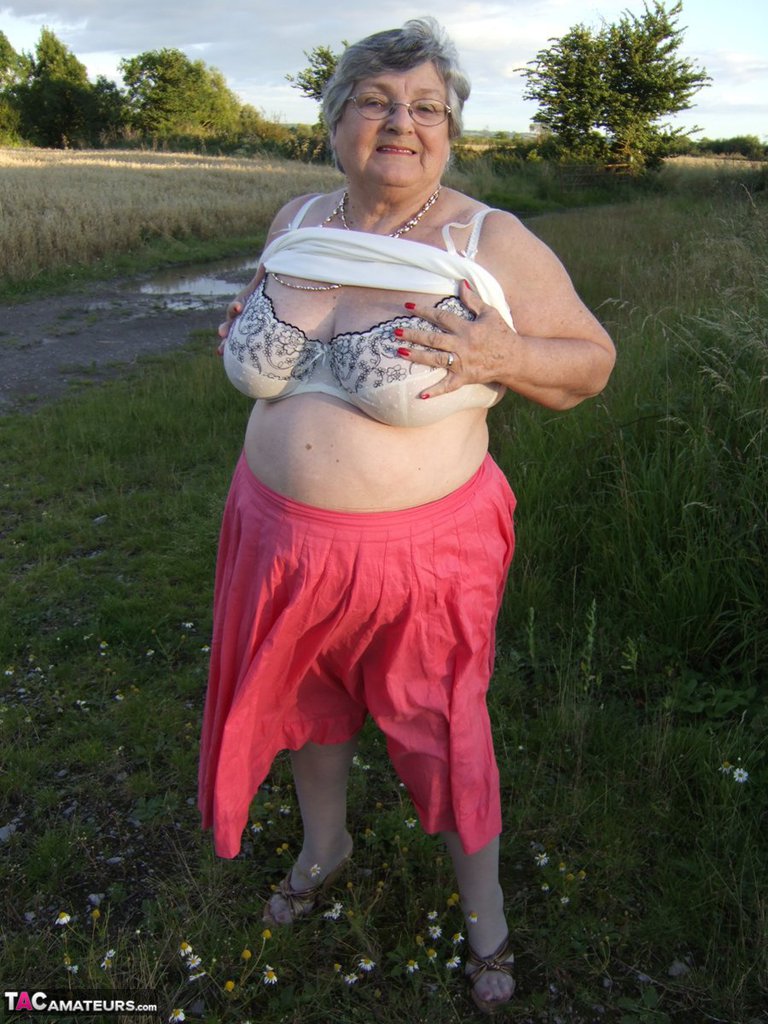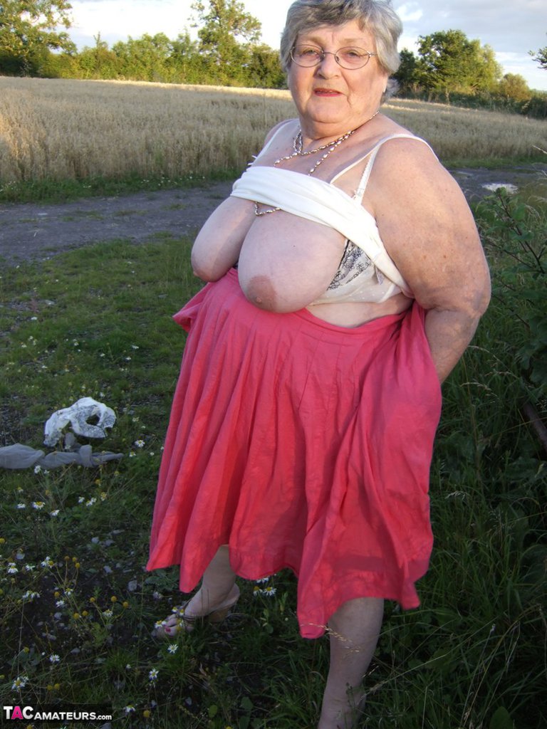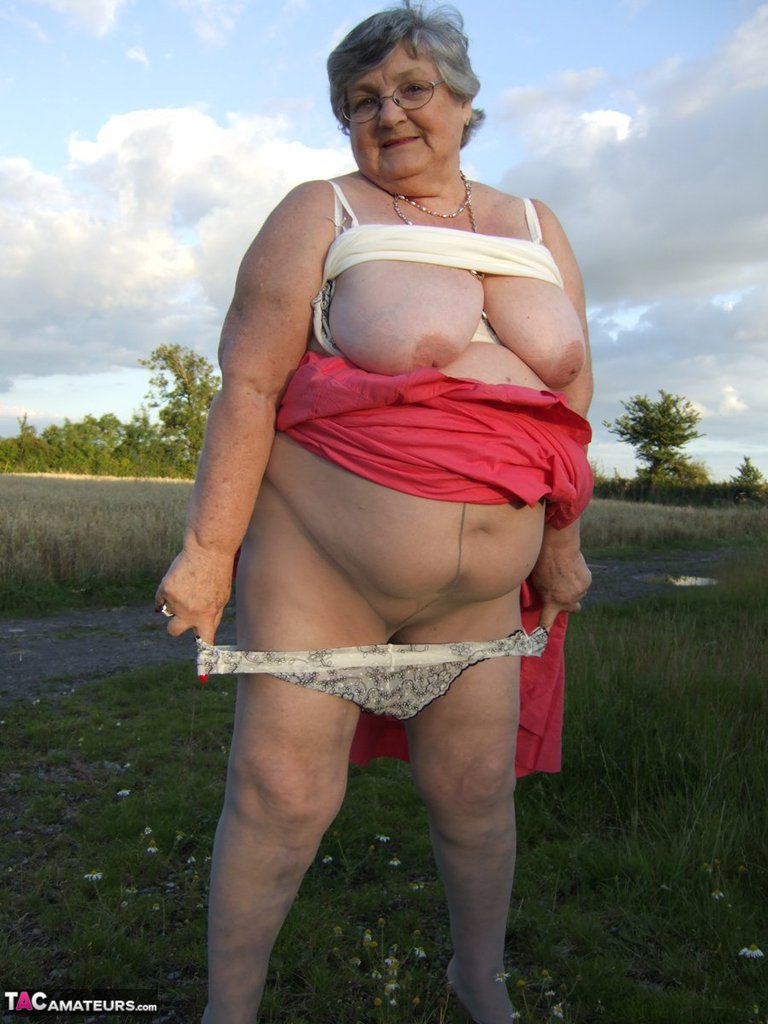 Obese Oma grandma Libby lifts her skirt in the countryside, flashing huge BBW ass in pantyhose and saggy big tits for outdoor granny upskirt lovers.